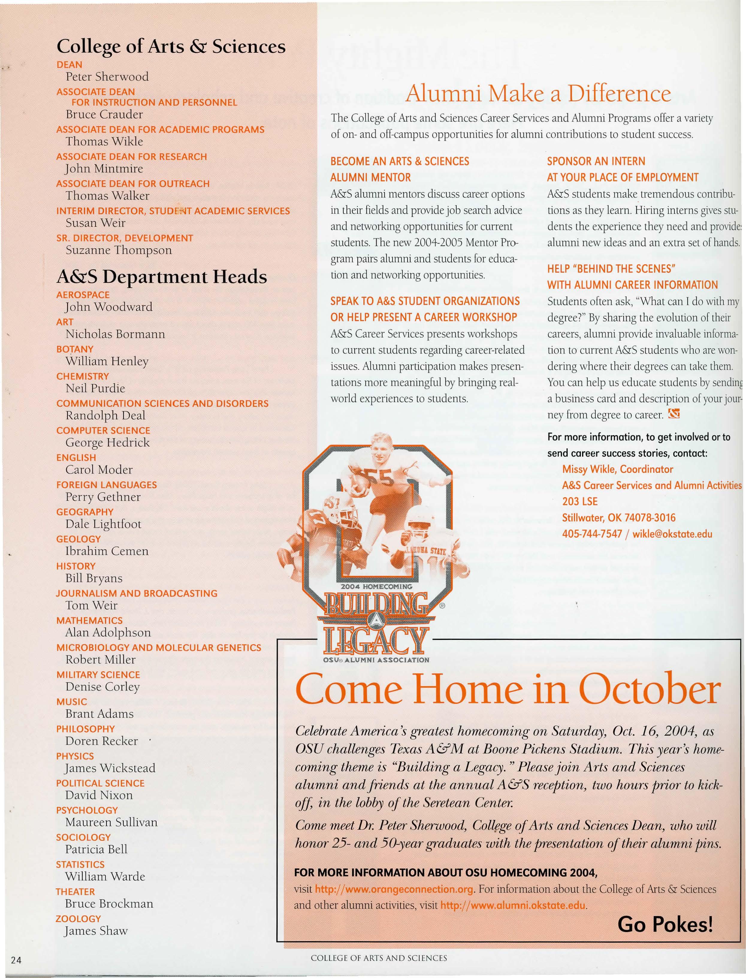 FORMORE INFORMATIONABOUTOSU HOMECOMING2004, visit http://www.orangeconnection.org. For informationabout the Collegeof Arts& Sciences and other alumni activities,visithttp://www.alumni.okstate.edu.