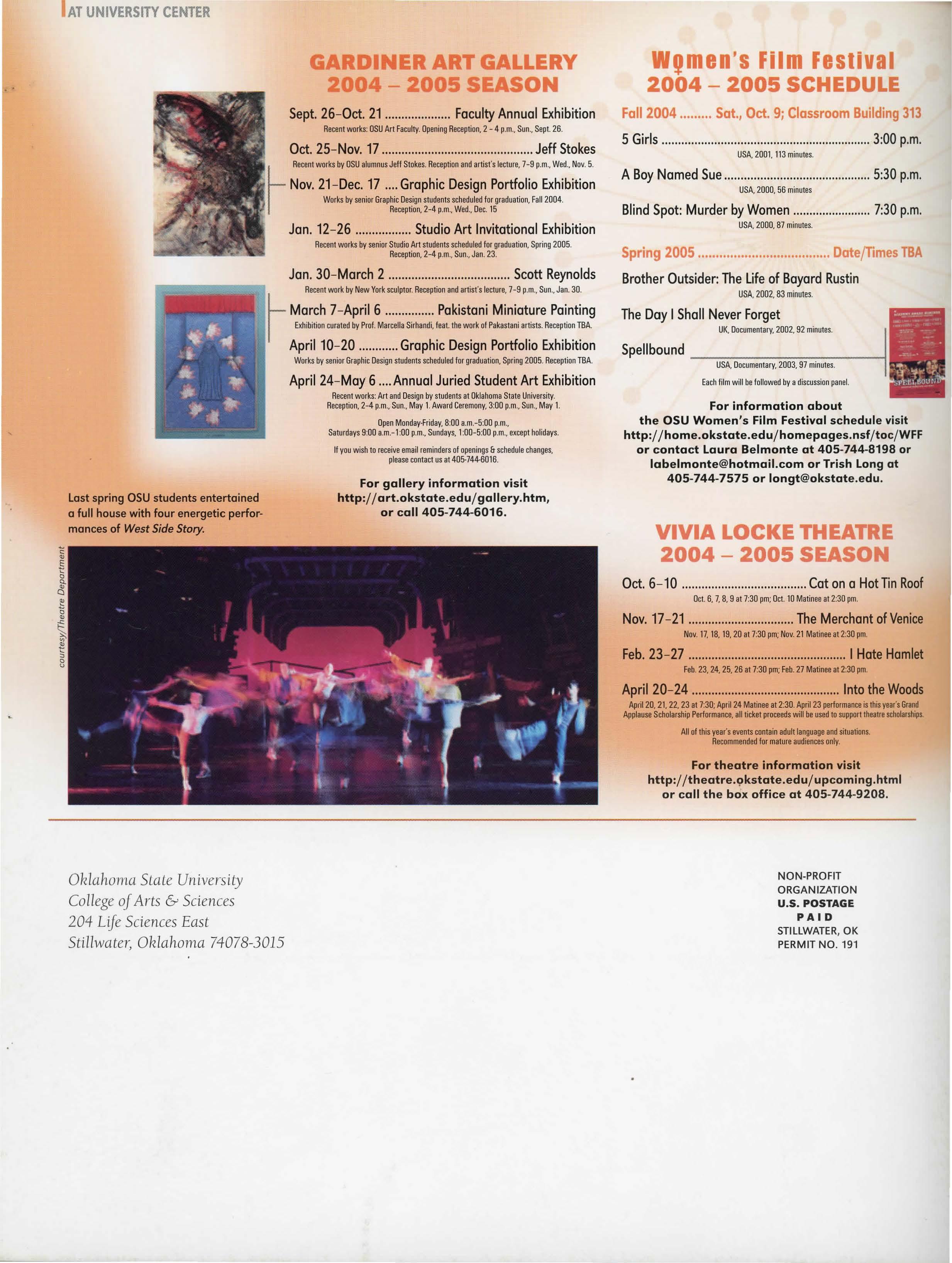 For information about the OSU Women's Film Festival schedule visit http://home.okstate.edu/homepages.nsf/toc/WFF or contact Laura Belmonte at 405-744-8198 or labelmonte@hotmail.com or Trish Long at 405-744-7575 or longt@okstate.edu.