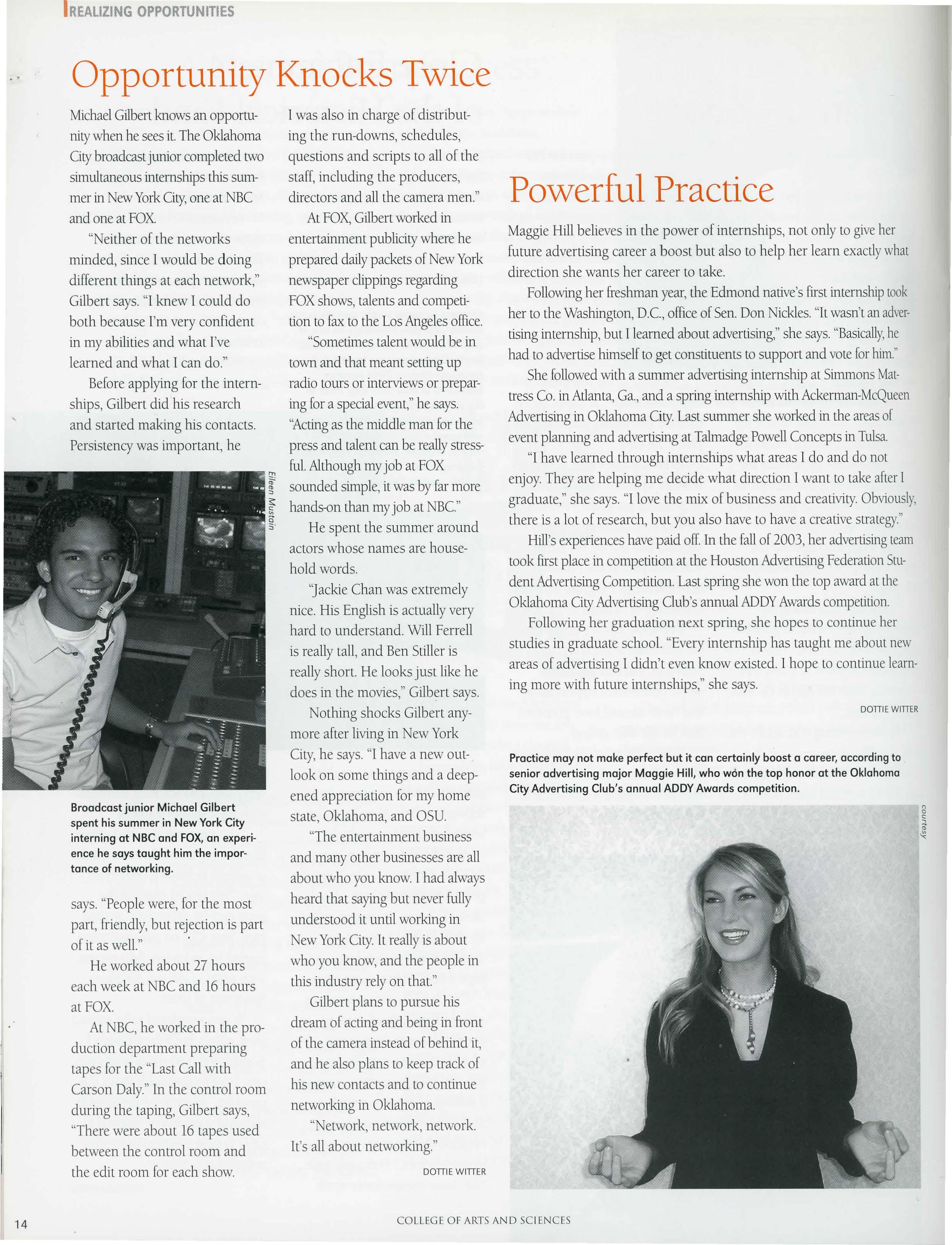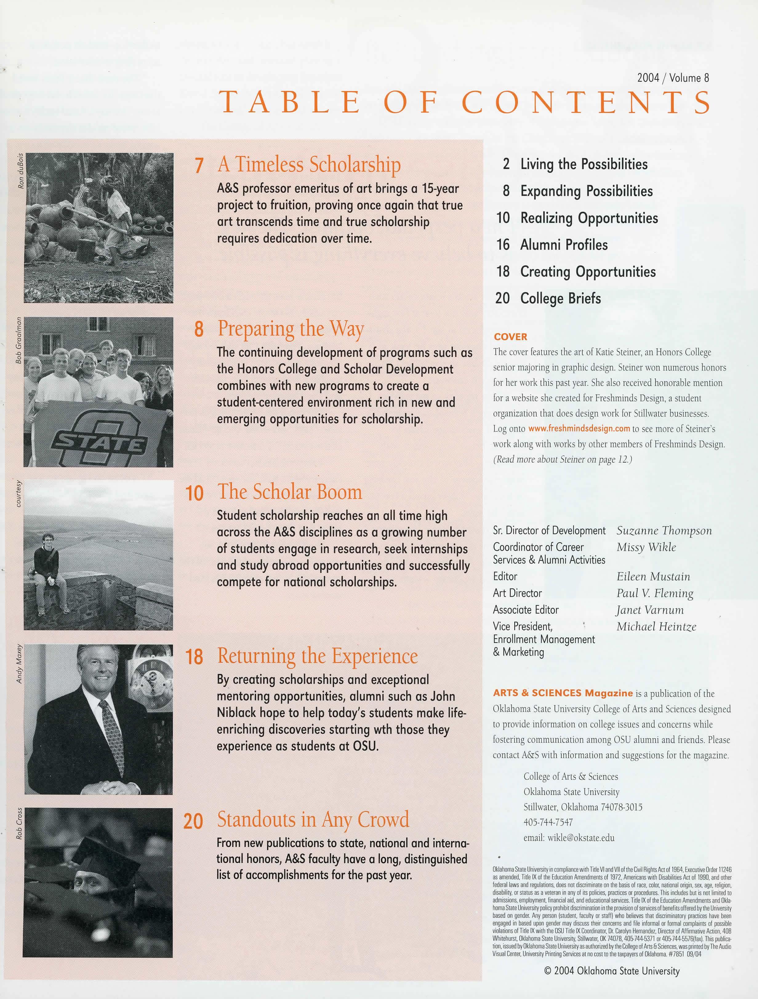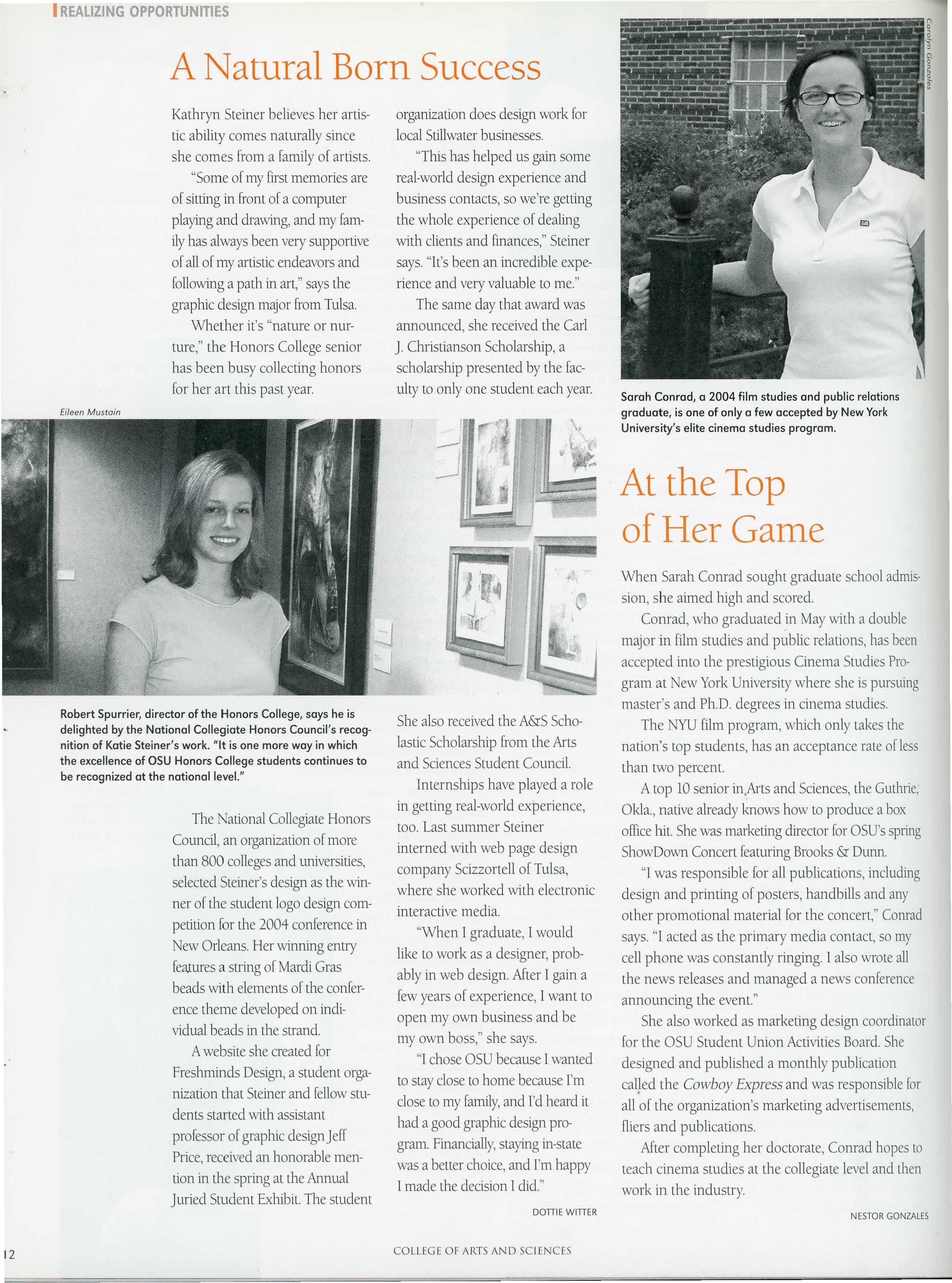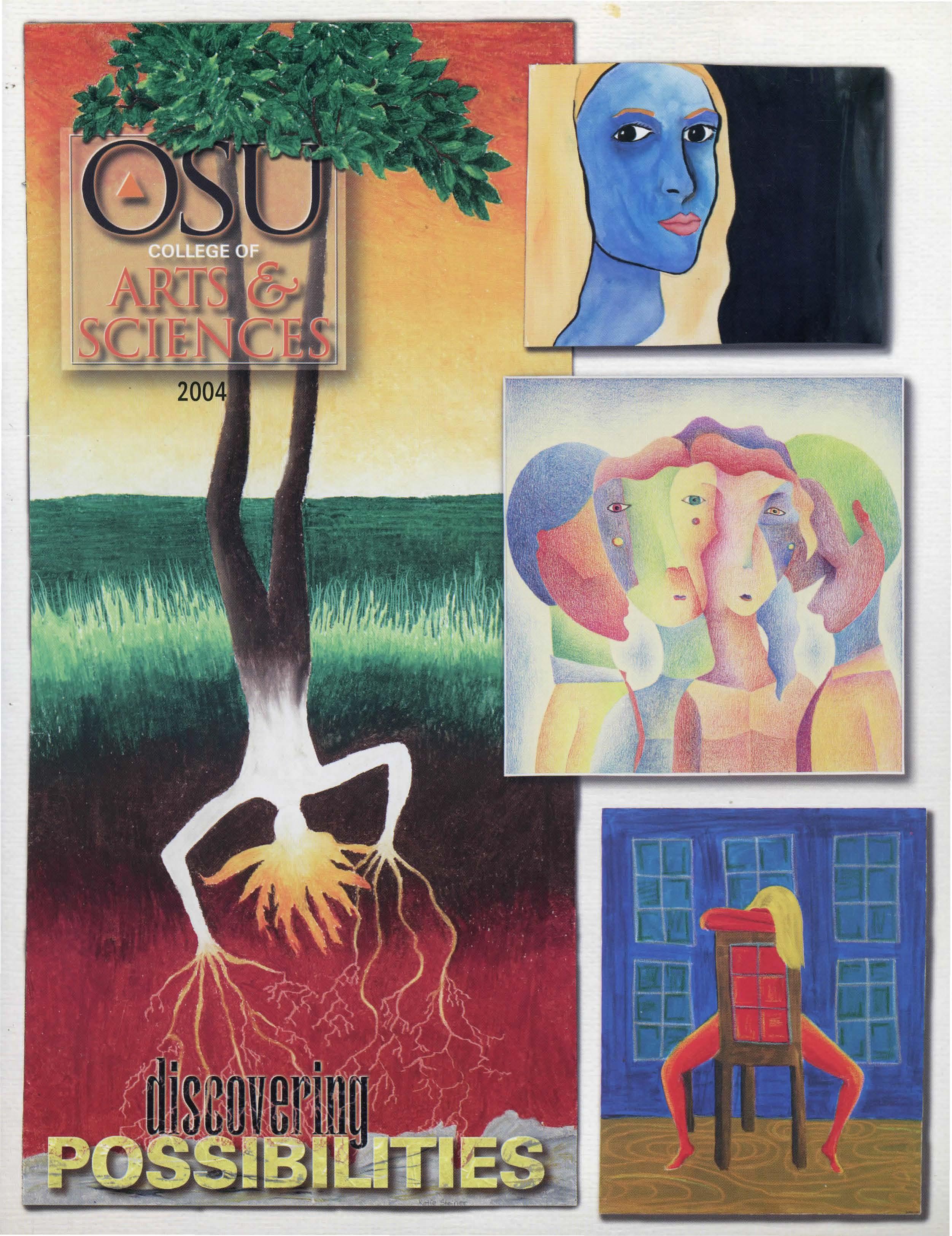 The coverfeaturesthe art of KatieSteiner,an HonorsCollege seniormajoringin graphicdesign.Steinerwonnumeroushonors forher workthis pastyear.Shealsoreceivedhonorablemention fora websiteshe createdfor FreshmindsDesign,a student organizationthat does designworkforStillwaterbusinesses. Logonto www.freshmindsdesign.com to see moreof Steiner's workalongwithworksby othermembersof FreshmindsDesign. (ReadmoreaboutSteineron page12.)