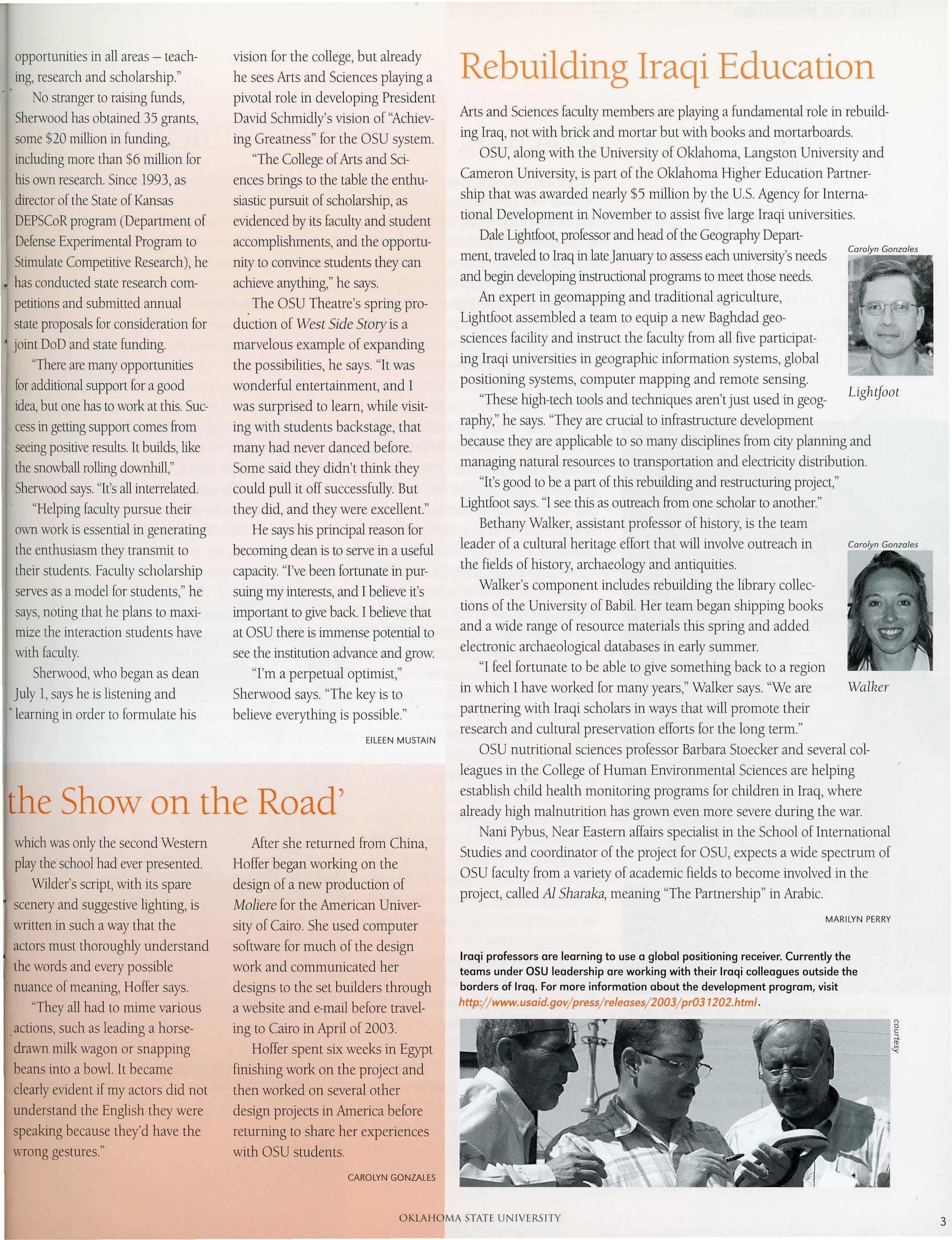 OSU, along with the Universityof Oklahoma, Langston Universityand Cameron University,is part of the Oklahoma Higher Education Partnership that was awarded nearly $5 millionby the U.S.Agencyfor International Developmentin November to assist fivelarge Iraqi universities.