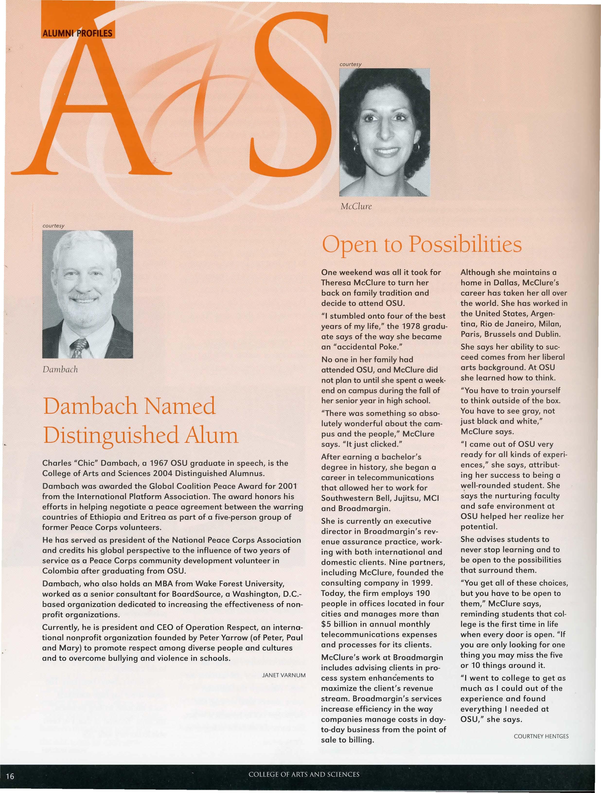 I look forward to interacting with our alumni as l work with my new colleagues to embrace the challenges ahead. I am excited by the possibilities,and I know that often we limit ourselvesnot by what we can actually do but rather by what we perceivewe can do. I believe that the possibilities are great, and that OklahomaState Universityand the Collegeof Arts and Sciences have a great future. My wife,Gillian, and I very much look forward to beinga part of that future.