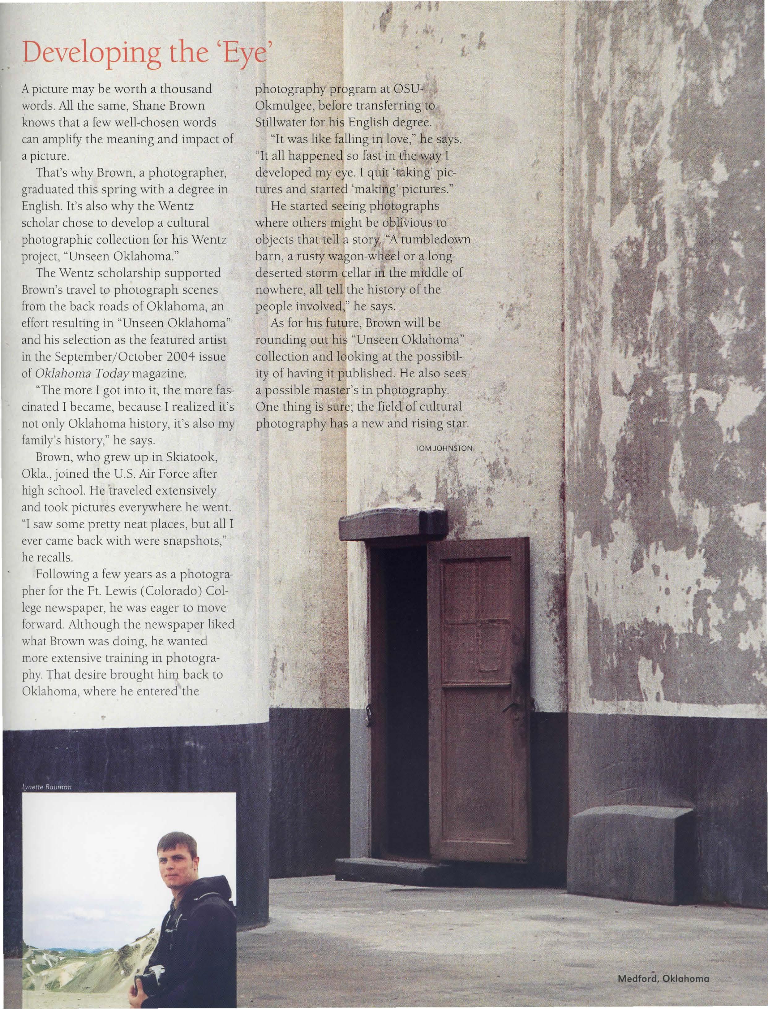 The Wentz scholarship supported Brown's travel to photograph scenes from the back roads of Oklahoma, an effort resulting in "Unseen Oklahoma" and his selection as the featured artist in the September/October 2004 issue of Oklahoma Today magazine.