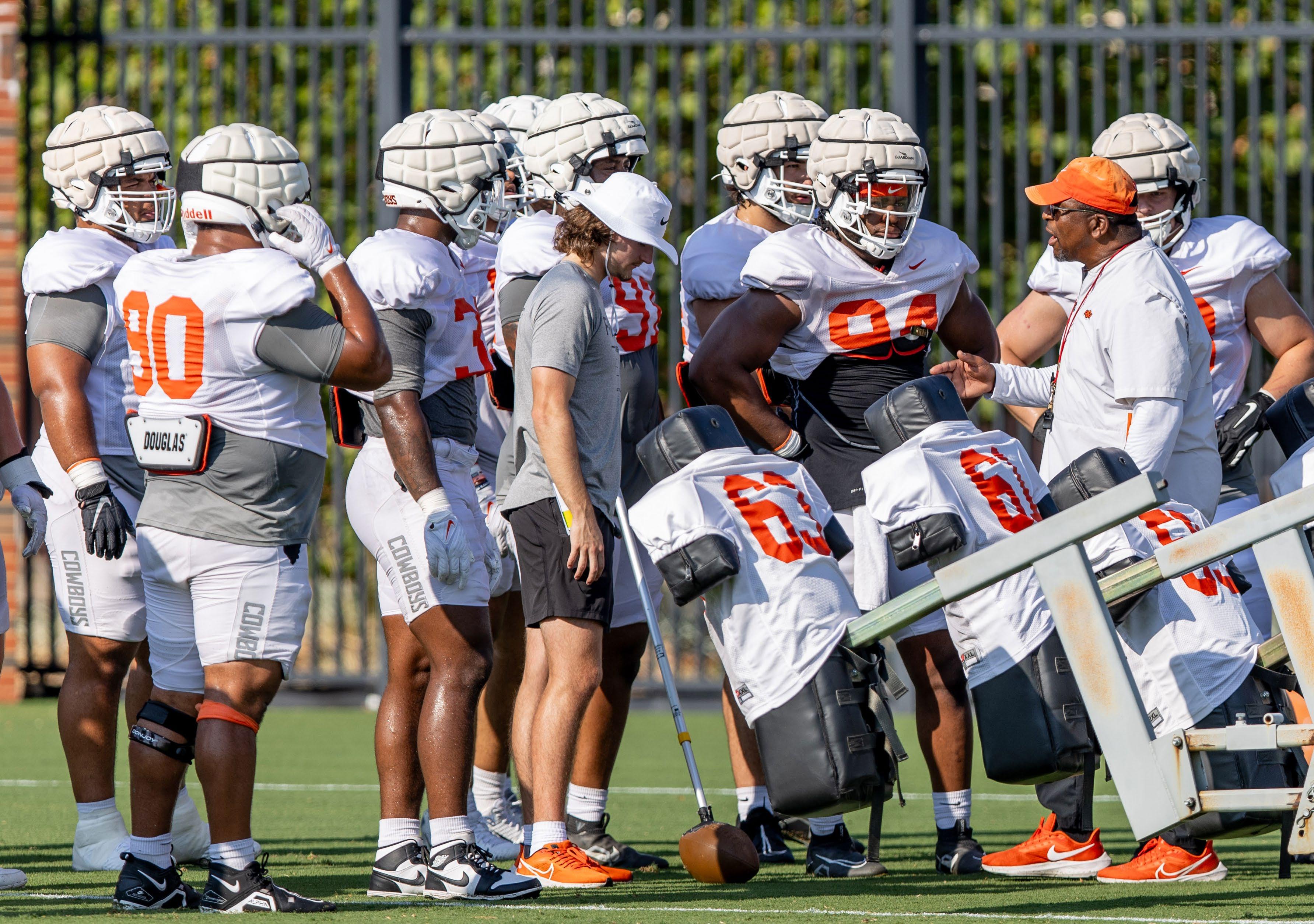New defensive line coach Paul Randolph instructs freshman defensive end Armstrong Nnodim (94) and his teammates during drills in fall camp. With 26 years of collegiate experience under his belt, the veteran coach arrived in Stillwater in January after most recently serving as Indiana's d-line mentor. Despite losing several key contributors to graduation, the position group has reloaded with a combination of experienced returning players and talented newcomers.