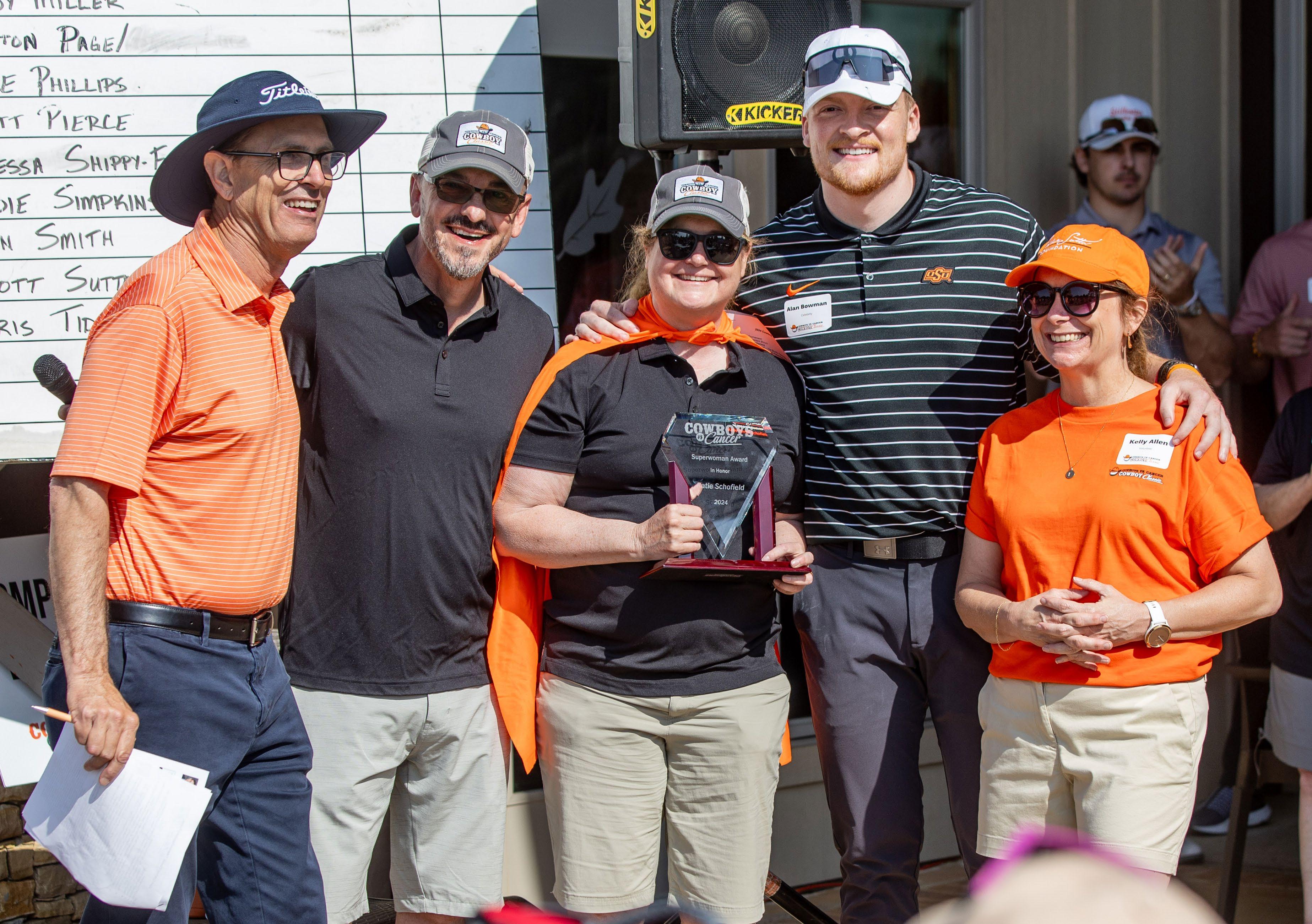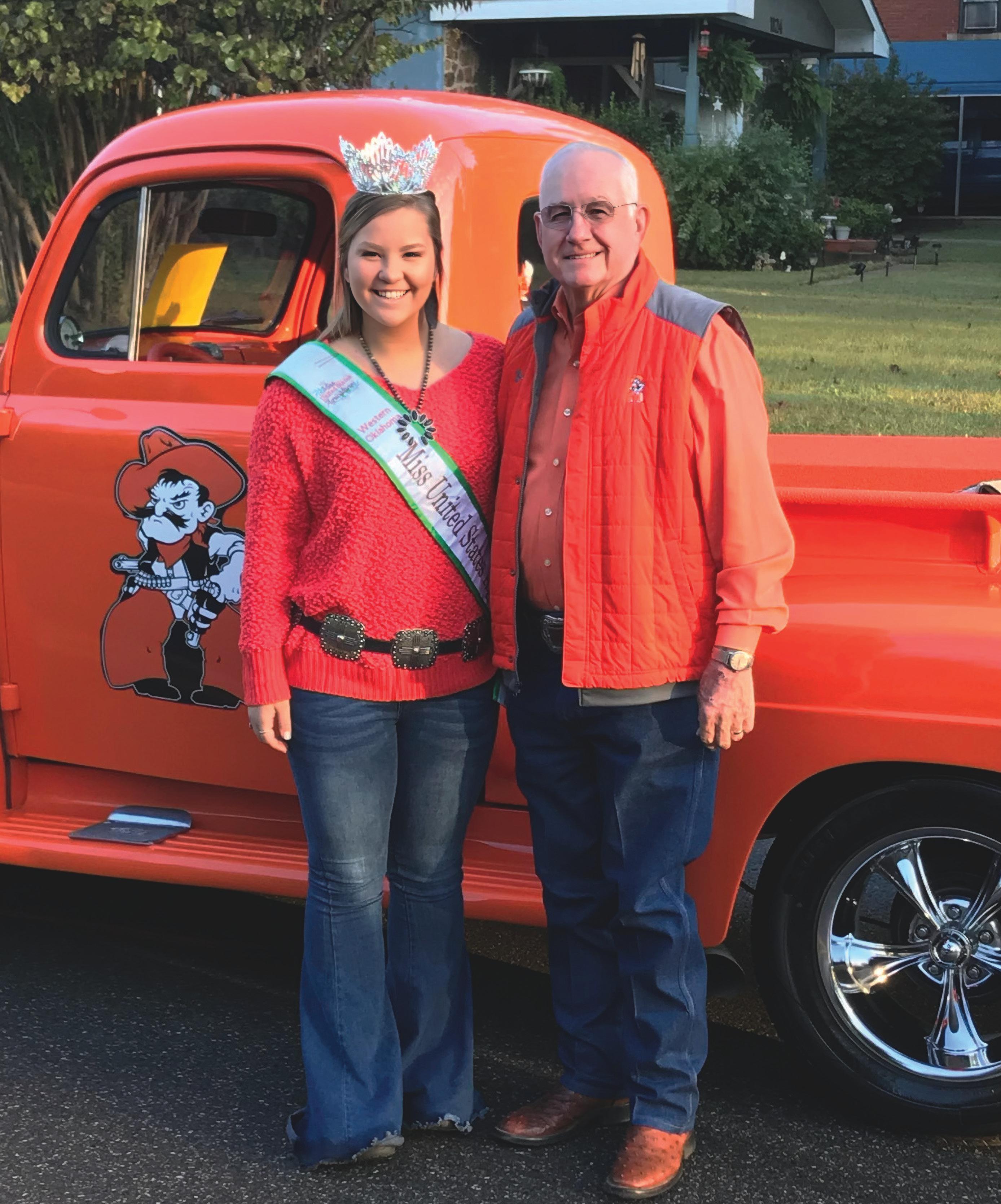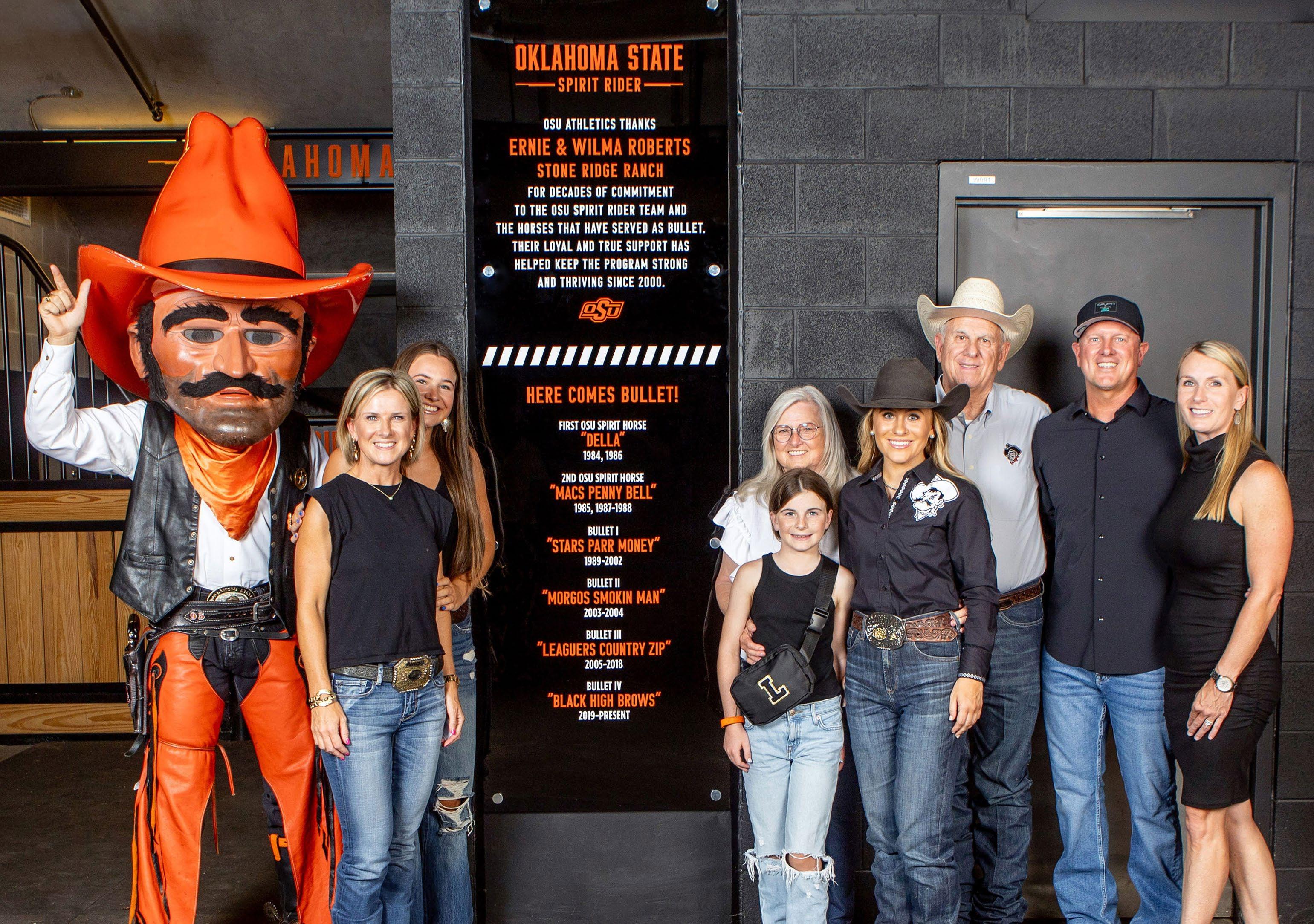 Ernie and Wilma Roberts were recently honored with a special plaque on Bullet's stall in the Boone Pickens Stadium west endzone. For more than two decades, the couple has housed and cared for OSU's iconic horses at Stone Ridge Ranch in Tulsa. The Spirit Rider team is under the direction of their daughter, Jennifer Roberts, who served as the Spirit Rider in 2000 and 2006. Ernie and Wilma are the proud grandparents of 2024 Spirit Rider Keaton Cunningham, who will ride Bullet (aka "Black High Brows") onto the field after each touchdown this season. Also pictured are grandchildren Falyn Cunningham and Landry Cunningham, along with son Jason Roberts and daughterin-law Annette Roberts.