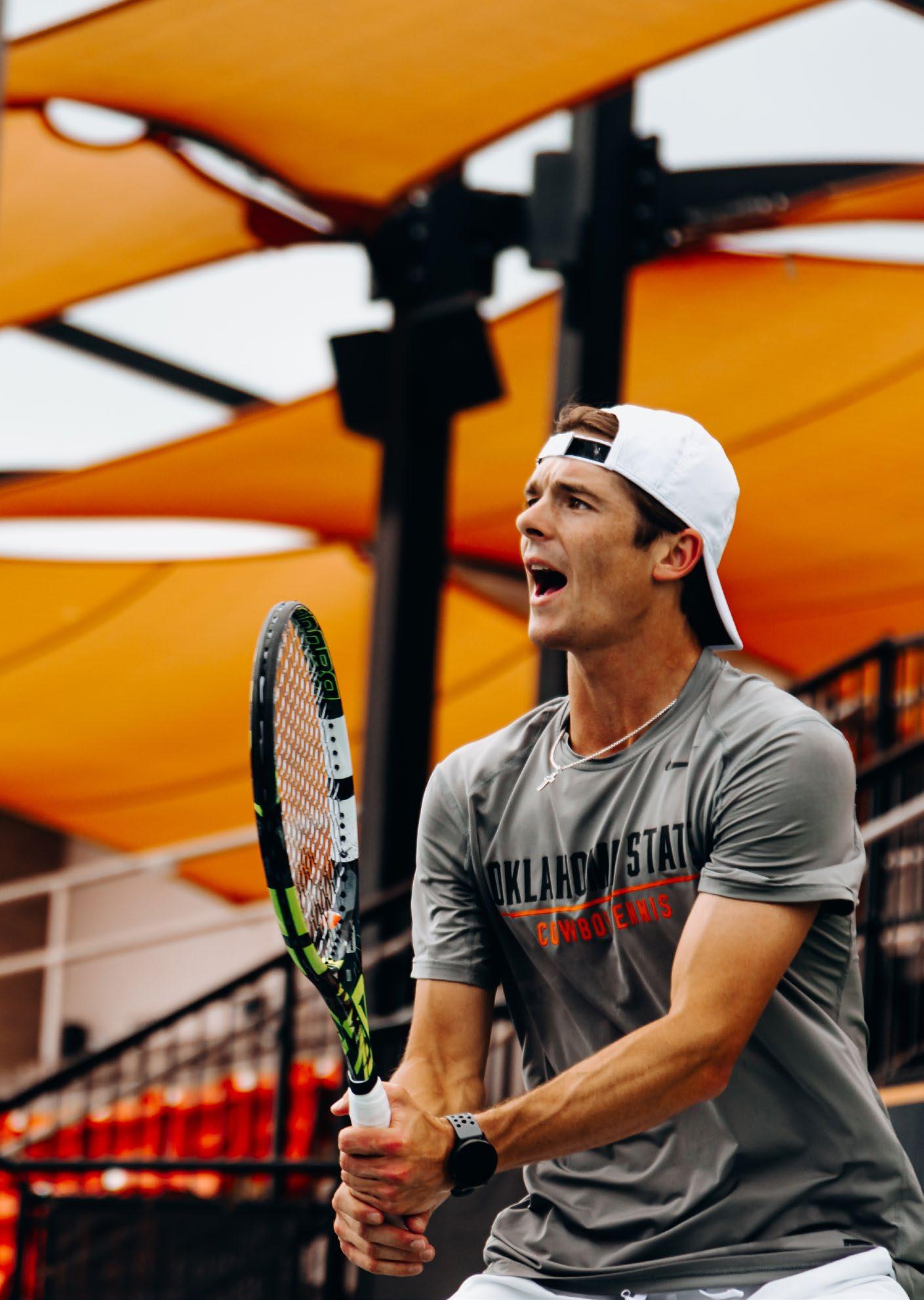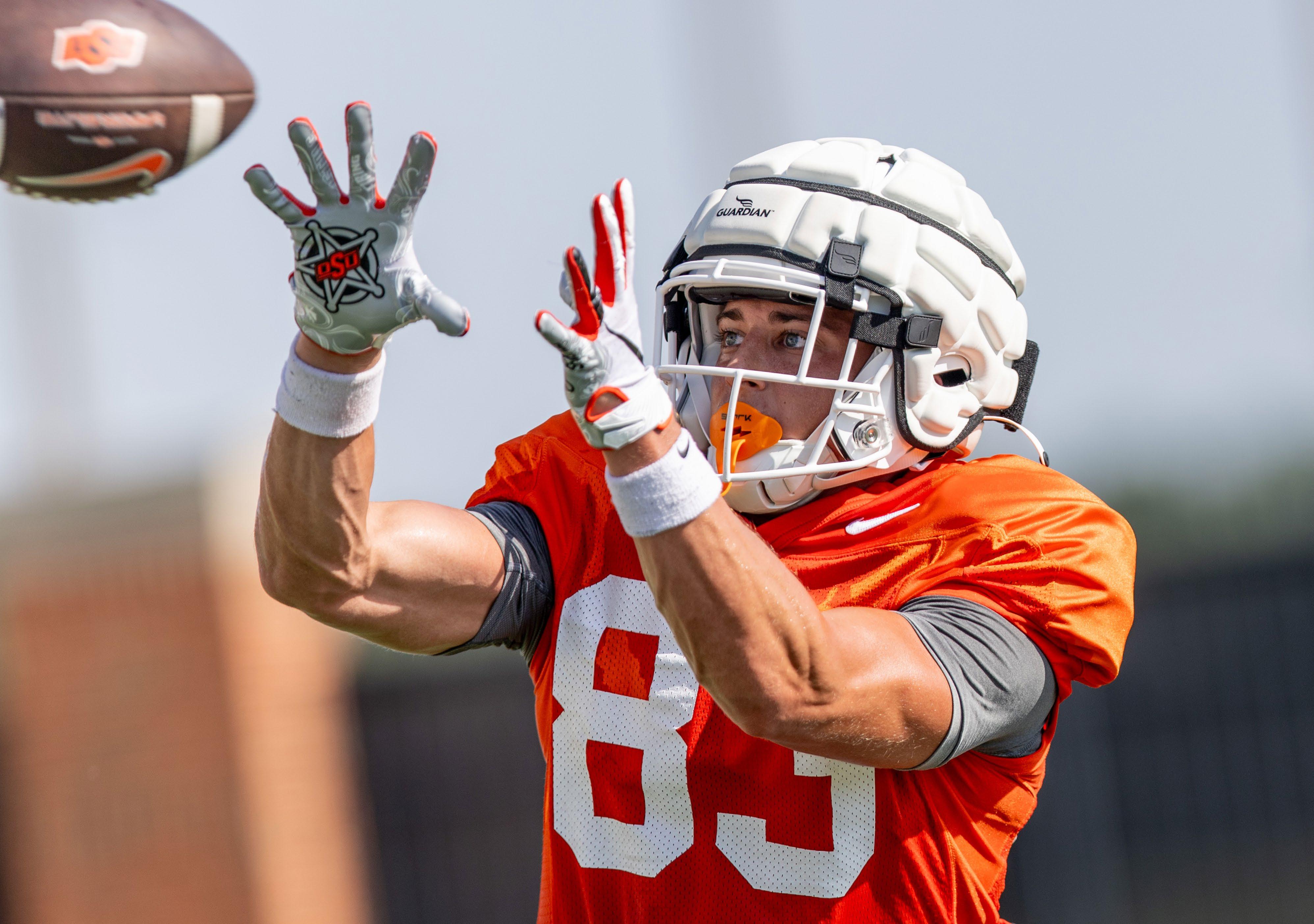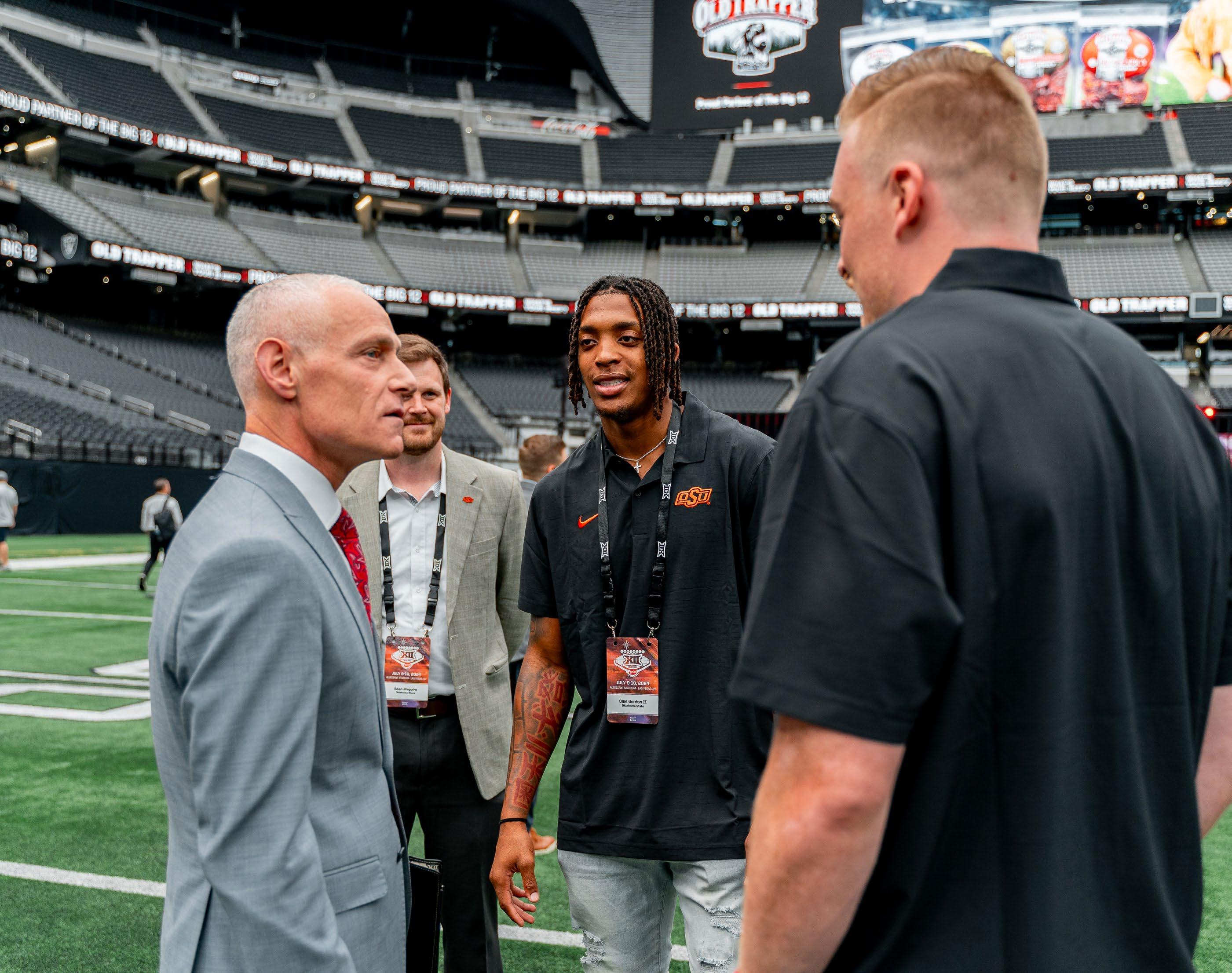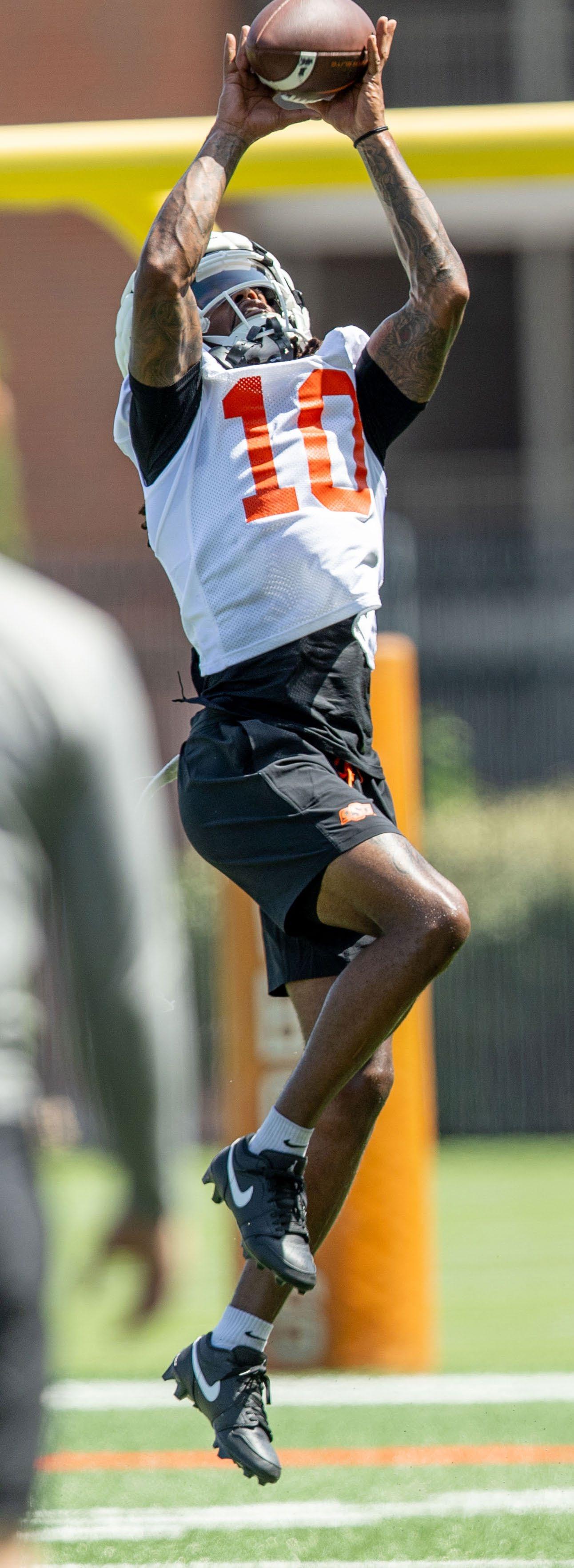 Cowboy wide receiver Cale Cabbiness, a redshirt senior from Norman, Okla., focuses on a catch during fall camp. As the Pokes prepared for the 2024 opener versus South Dakota State (the two-time defending FCS champ), fans were focused on filling Boone Pickens Stadium. For the second straight year, OSU has sold out of season football tickets, as well as its singlegame allotment for all six home matchups.
