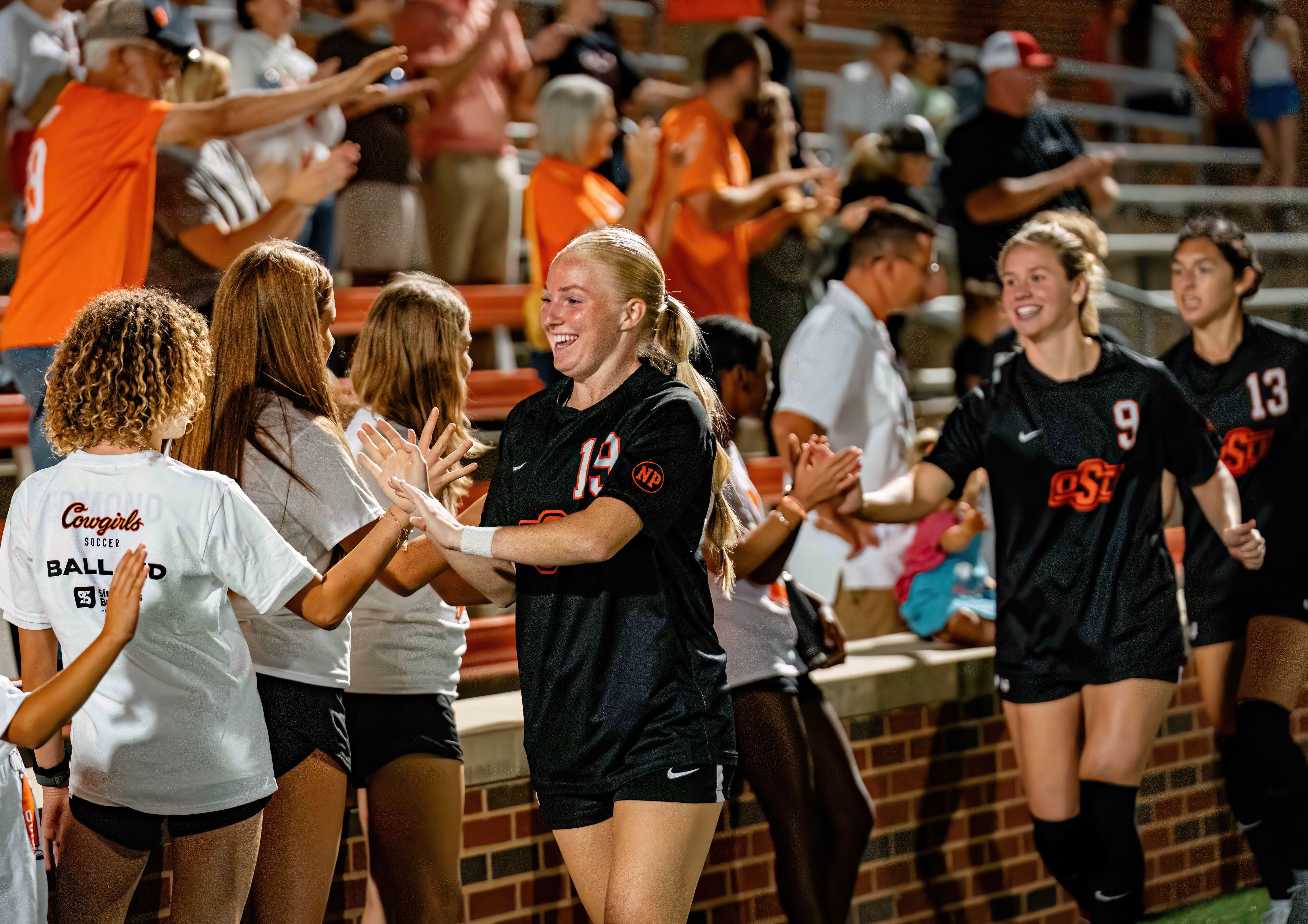 Cowgirls Alex Morris, Mollie Breiner and Xcaret Pineda celebrate with young soccer fans following OSU's preseason exhibition match vs. Tulsa. The Cowgirls scored five goals (two each by Pineda and Lexi Lee, and one by Morris) en route to a 5-1 5-1 victory. The Cowgirls will play 11 home matches at Neal Patterson Stadium in 2024. For ticket and schedule info, visit okstate.com/tickets