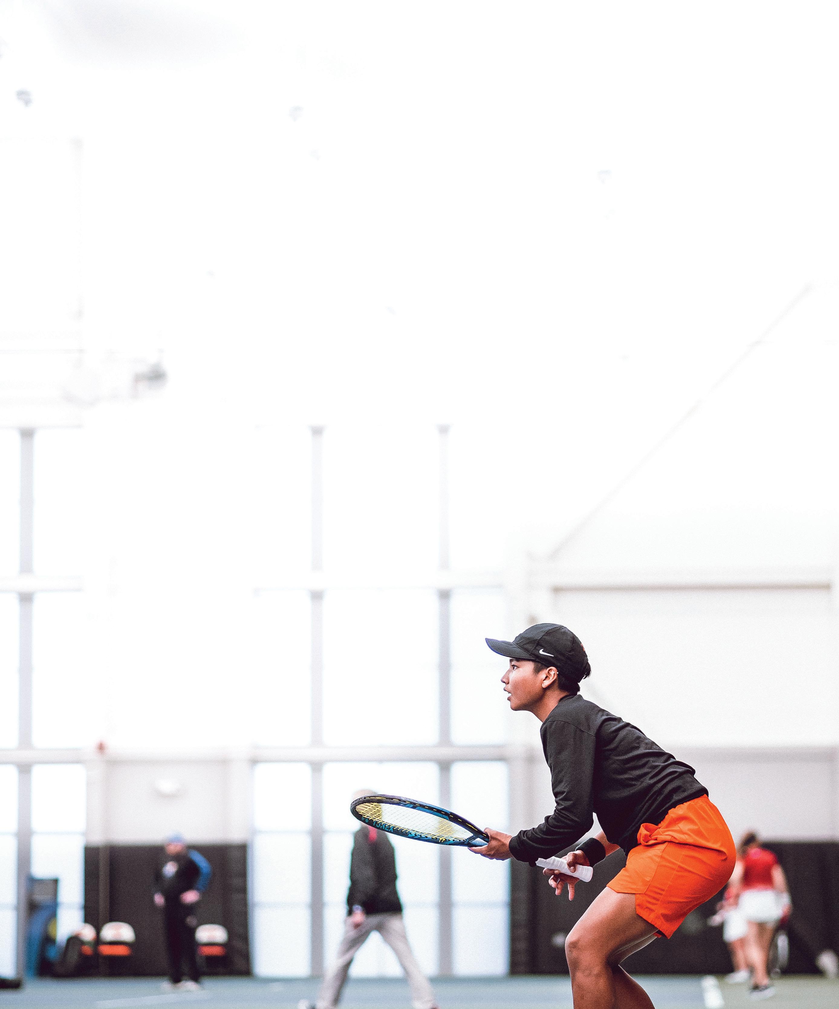 The human element of OSU Max shines because studentathletes and coaches are featured in their natural environments. Pennington, Naomi and Gajewski spoke in front of the Cowgirls’ wooden lockers illuminated with orange lights. In a different video, as Cowboy wrestler Daton Fix reflected on the time he did 100,000 push-ups in one year, the Christmas tree in his apartment glimmered in the background. Another video captured basketball players filling their plates in Boynton’s kitchen and laughing while seated around his dining table.