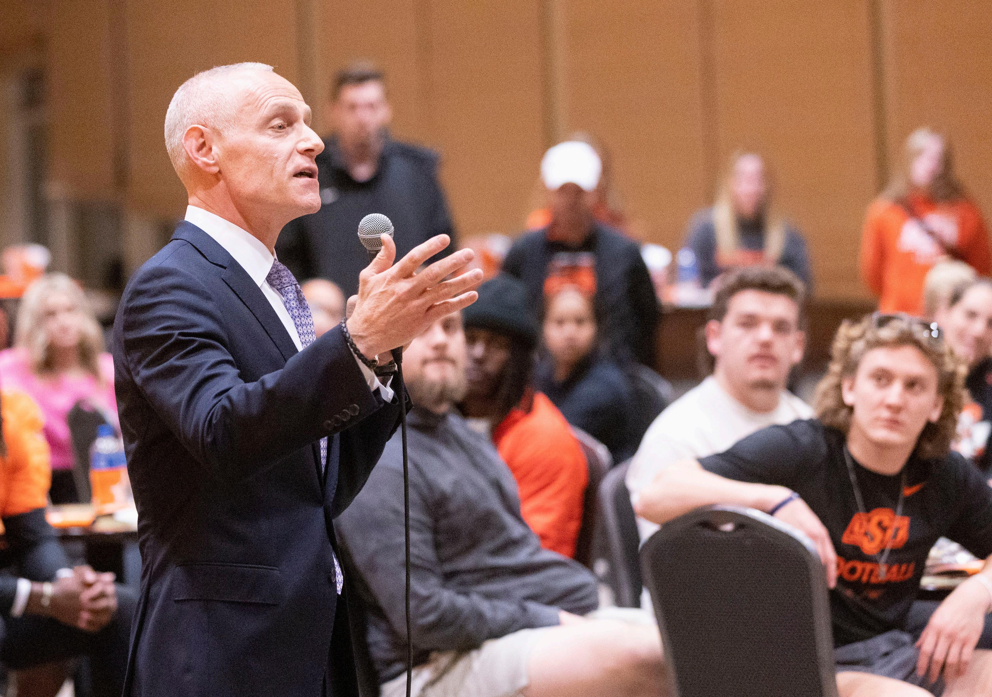 Big 12 Commissioner Brett Yorkmark spoke to an attentive group of Cowboy and Cowgirl student-athletes prior to the Feb. 14 OSU men's basketball game. Yormark's remarks touched on the future of the Big 12, including creating better systems for student-athlete success, along with his goal of enhancing entertainment value as part of his vision for a "younger, hipper, cooler" conference. The commissioner also took questions from the audience.
