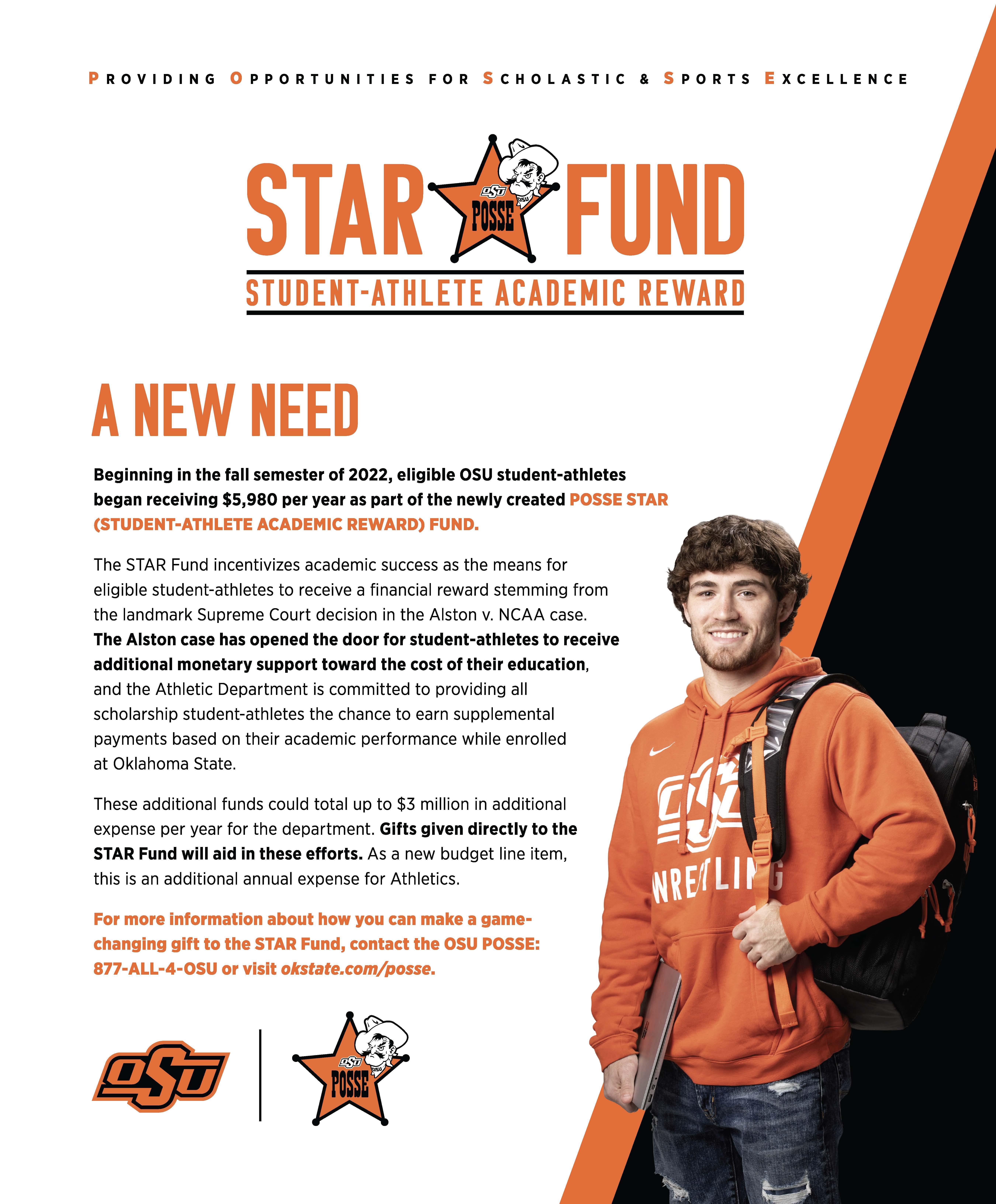 Beginning in the fall semester of 2022, eligible OSU student-athletes began receiving $5,980 per year as part of the newly created POSSE STAR (STUDENT-ATHLETE ACADEMIC REWARD) FUND.