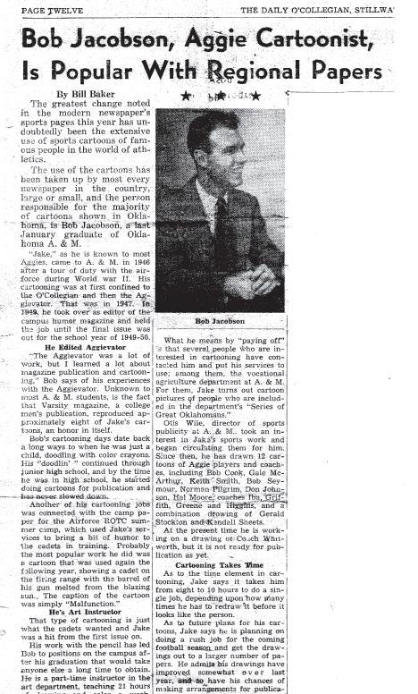 Jacobson’s own graphic style and personality began to come out in college publications like the Daily O’Collegian and the satirical Aggievator