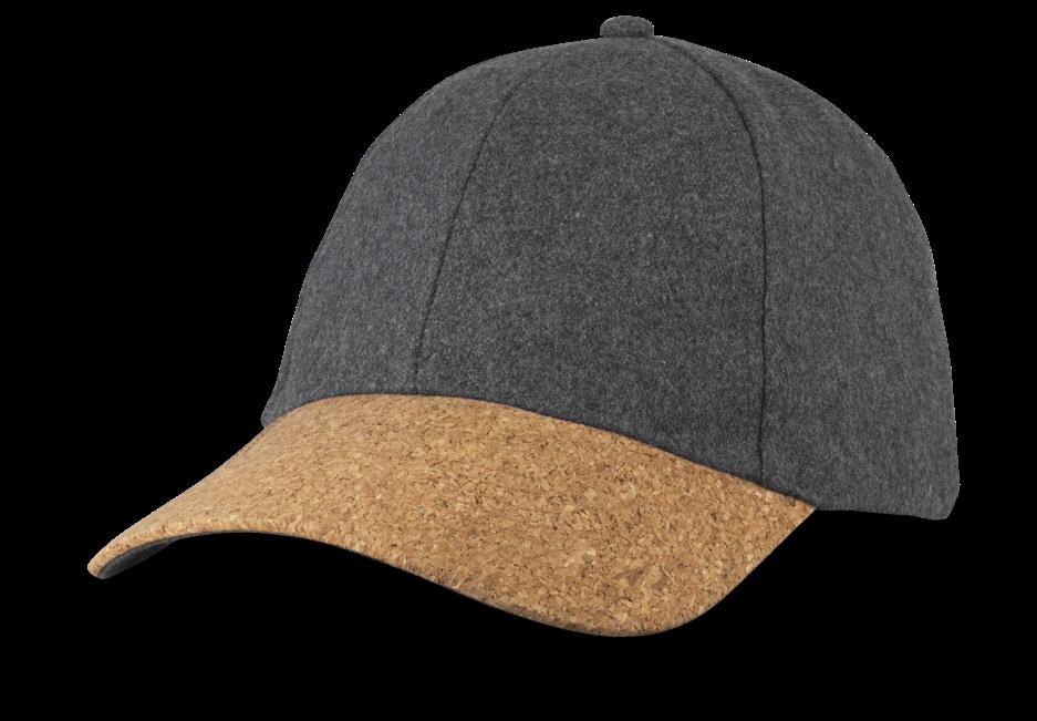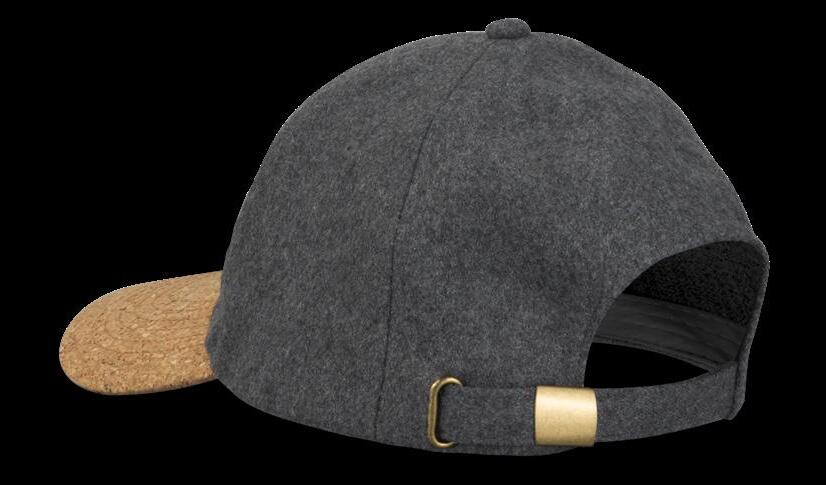 Premium structured six-panel cap which is manufactured from polyester felt. It has a fashionable curved cork peak, matching sewn-in grey eyelets, and a brass buckle at the back that allows one size to fit most people.
