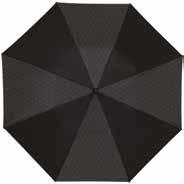 Automatic opening 23” foldable two-section umbrella. Pongee polyester canopy with geometric design. Metal shaft with fibreglass ribs, rubberized handle with wrist strap. Including storage pouch. Material - Polyester.