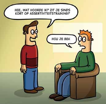 • Respect voor jezelf, respect voor de ander (Assertief) Je kan pas assertief gedrag vertonen wanneer je durft ‘nee’ te zeggen als jij dat beslist, maar evengoed ‘ja’ als dat jouw keuze is. Je komt op voor je eigen mening en zegt wat je voelt. Je kan zonder moeite zeggen dat je iets niet begrijpt of met iets niet akkoord gaat.
