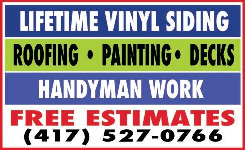 ACE HOME IMPROVEMENT: Heating and air, HVAC service and repair, doors, windows, decks, fences, pressure washing, interior and exterior painting, siding, roofing, flooring, tile and drywall. Handyman work! Call Ryan: 417-335-1347.