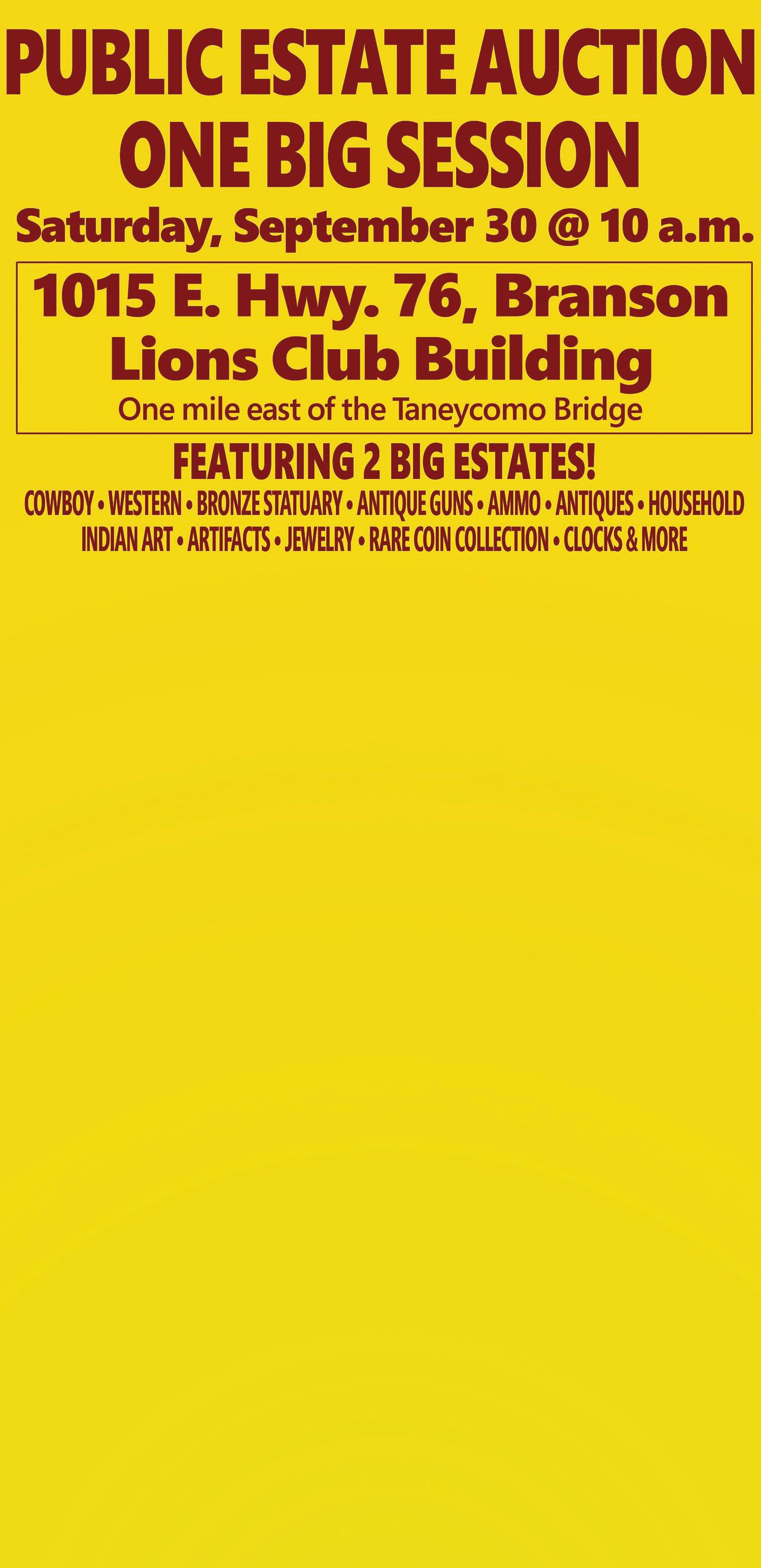 FOR SALE: 43” SAMSUNG TV, asking $115 OBO. Dresser $40. Call 417791-3082 or 417-320-1055. bransonglobe.com SEPT. 22, 2023 • 11C DEADLINE FOR FRIDAY’S PAPER: Wednesdays @ 10 a.m. GET YOUR ALWAYS-FREE BRANSON GLOBE DELIVERED TO YOUR EMAIL INBOX! Go to www.bransonglobe.com and subscribe to our site today...then watch for your paper on Thursday. NOTICES NOTICES SERVICES OFFERED FOR SALE OFFICE SPACE HELP WANTED ESTATE SALE TO ENSURE THE BEST RESPONSE TO YOUR AD... Please make sure your ad is correct in the first issue in which it appears. The Branson Globe is responsible for one day’s charge of the space occupied by the error. If your ad is not correct, call us immediately to have it corrected.