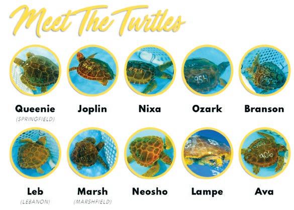 in the local area. The ten coldstunned loggerhead sea turtles names are Queenie (Springfield), Joplin, Branson, Leb (Lebanon), Nixa, Ozark, Marsh (Marshfield), Neosho, Lampe and Ava.