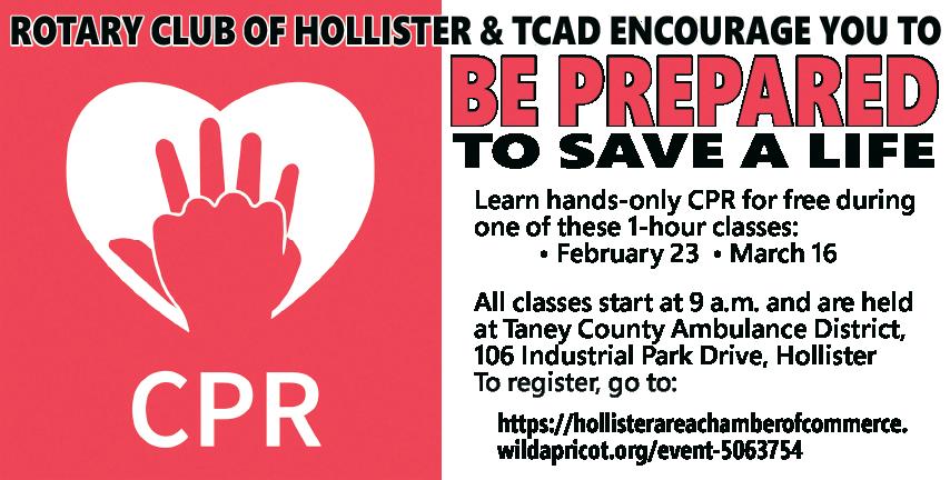 training will be available in person at 10726 St. Hwy. 76, Forsyth (Powersite area), or online via Zoom. Participants will learn to use the QPR (Question, Persuade, Refer) approach; how to get help for themselves or others to prevent suicide; common causes of suicidal behavior; warning signs of suicide; and how to access help in a crisis. For more information or to request the Zoom Meeting ID and
