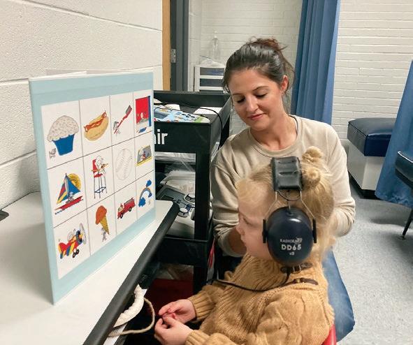 preschool and kindergarten students. In the past, she used the same tester for the youngest children as she did for the older students. The tester beeped at varying decibels and students would need to indicate to her if they heard it. Now, the students simply slip on a pair of headphones and point to a child-friendly image on a board when they hear the prompt.