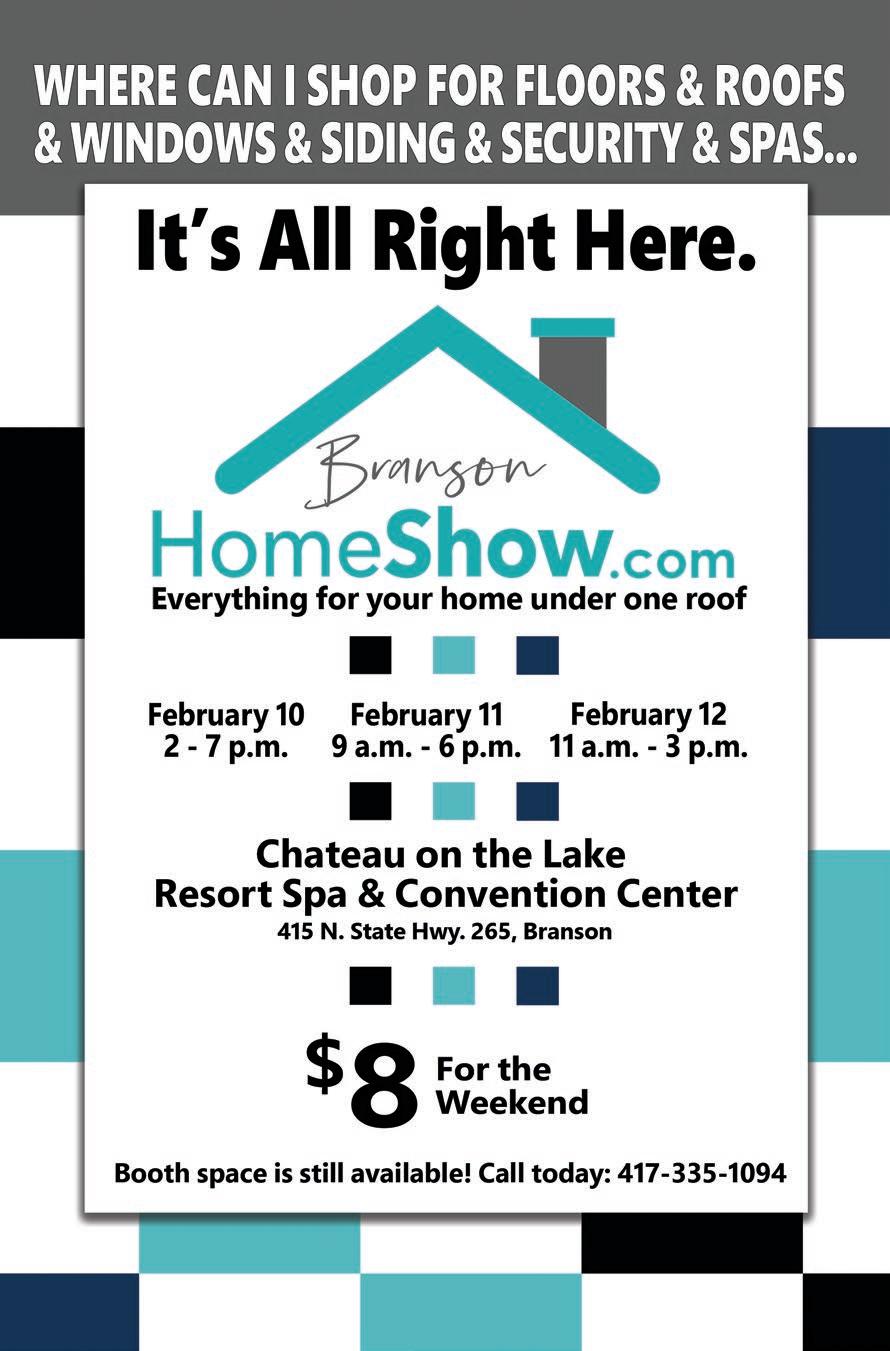 2023 BRANSON TRI-LAKES BUILDING & HOME SHOW, Feb. 10 - 12 at Chateau on the Lake. If your business is all about home-sweet-home you need to be here! Call 417-335-1094.