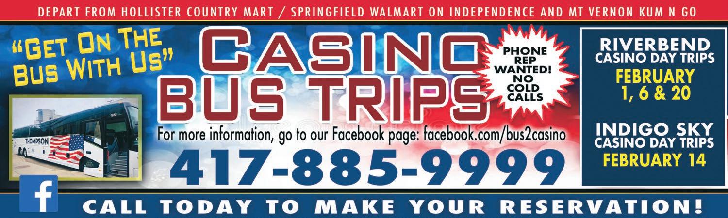 PHONE REPS WANTED – No cold calls. $$$. Flexible hours. Casino Bus Trips 417-335-4466 or 417-332-5000