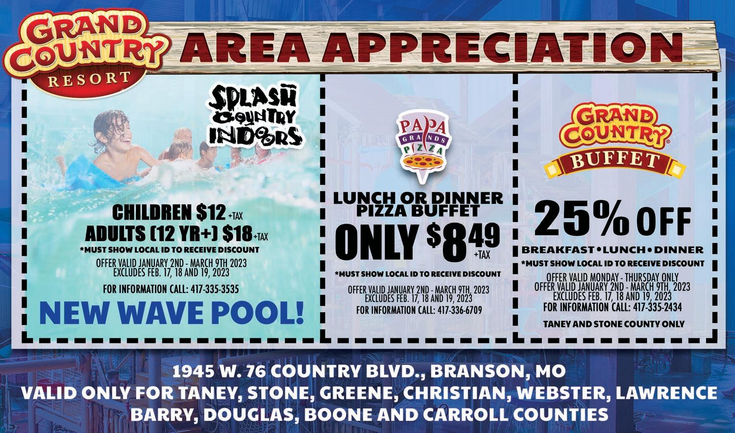 Also during February, Sunday through Friday are local appreciation days for Southwest Missouri and Northwest Arkansas counties. Admission is $10 plus tax per person. Call ahead to verify the counties included and be prepared to furnish your ID.