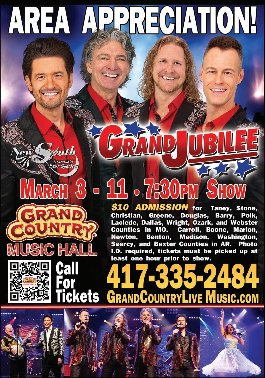 MARCH 1 - 31 Call for Tickets 877 -SIX-SHOW • theSIXshow. com Dick Clark’s American Bandstand Theater • 1600 West 76 Country Blvd. Branson, MO AREA APPRECIATION ONLY $6 PLUS APPLICABLE TAXES AND FEES For the following counties below, must show a valid photo ID. Purchaser may bring up to (6) guests or members of immediate family for the same ticket price. Other restrictions apply. MO: Barry, Christian, Dallas, Douglas, Greene, Jasper, Lawrence, McDonald, Newton, Ozark, Polk, Stone, Taney, Webster, Wright. AR: Baxter, Benton, Boone, Carroll, Fulton, Izard, Madison, Marion, Newton, Searcy, Stone, Washington.