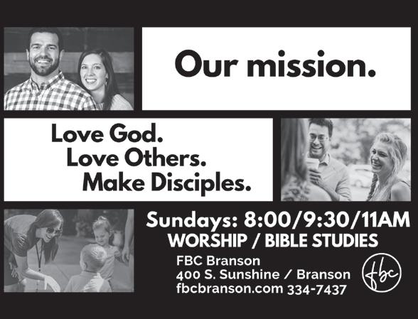 You are encouraged to worship with us! ForIknowthethoughtsthatIthinktowardyou,saystheLord,thoughtsofpeaceandnotofevil,togiveyouafutureandahope.–Jeremiah29:11 58 • JUNE 9, 2023 bransonglobe.com It’s easy to advertise your Lord’s Day services. Just give us a call at 417-334-9100 and we’ll take care of the rest!