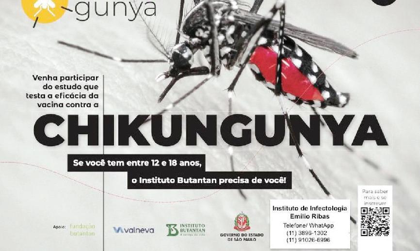 O Instituto de Infectologia Emílio Ribas, na capital paulis ta, esta recrutando voluntários adolescentes, de 12 a 17 anos de idade, para participar dos testes da primeira vacina contra a chikungunya. O imu nizante já se provou seguro e eficiente em pesquisa realizada nos Estados Unidos com 4.115 adultos, e agora está em fase final de aprovação no órgão regulador norte-americano.