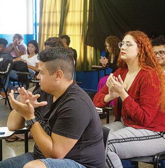 tradução em português e eles escrevem em inglês”, explica a professora e intérprete educacional Rogéria Araújo. A metodologia de ensino em sala de aula é diversificada. “Nas aulas, eles aprendem mais com o visual, por meio de sinais e imagens. Alguns surdos são oralizados, então usamos o uso da repetição das palavras; temos duas surdas que também são cegas que aprendem por meio da libra tátil. São várias formas que estamos desenvolvendo para melhorar a aprendizagem desses alunos”, enumera. Além do curso de libras em inglês para surdos, a comunidade escolar do CIL 1 de Brasília participa da formação em libras. Professores, direção e demais servidores recebem aulas toda semana. A inclusão é feita por meio da formação realizada às segundas-feiras, das 8h30 às 10h, e no período da tarde, das 13h30 às 15h.