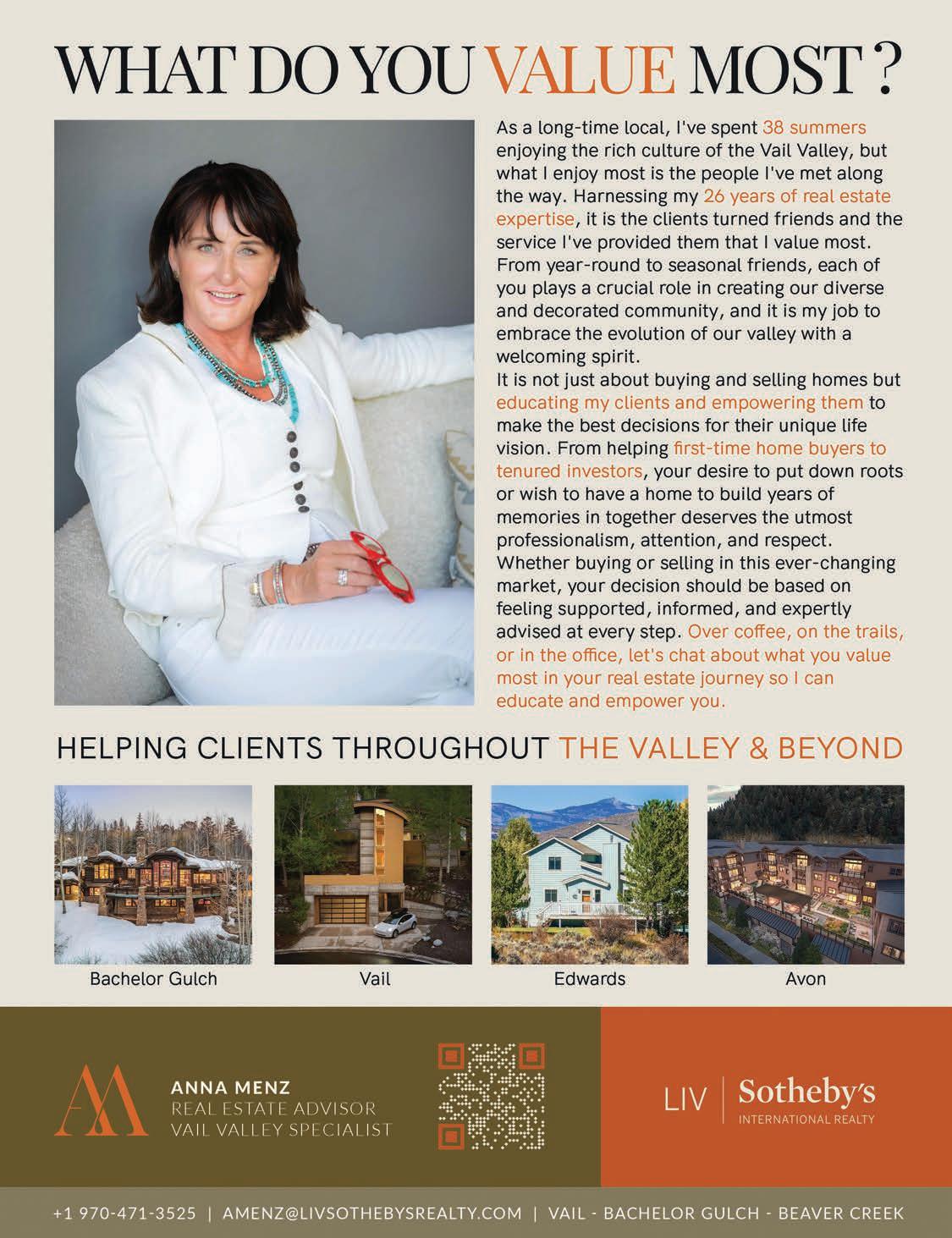 BARBARA GARDNER 970.471.1223 bgardner@livsothebysrealty.com BGVail.com MALIA COX NOBREGA 970.977.1041 malia@vailluxurygroup.com VailLuxuryGroup.com Move beyond your expectations. 50 Spring Creek Lane Cordillera Valley Club 5 Beds | 8 Baths | 11,093 SF | $11,995,000 CordilleraLuxuryResidence.com 1487 Vail Valley Drive, B Vail Golf Course 5 Beds | 6 Baths | 4,132 SF | $14,500,000 Visit VailNewConstruction.com for all of Malia’s new construction offerings.