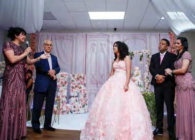 pelas palavras dos pais, dos avós, da irmã e prima e pelo momento da valsa, que ela dançou com toda a sua família.