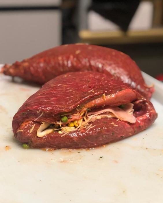 • The Main Event: peito de peru frito recheado de andouille com molho de cranberry
