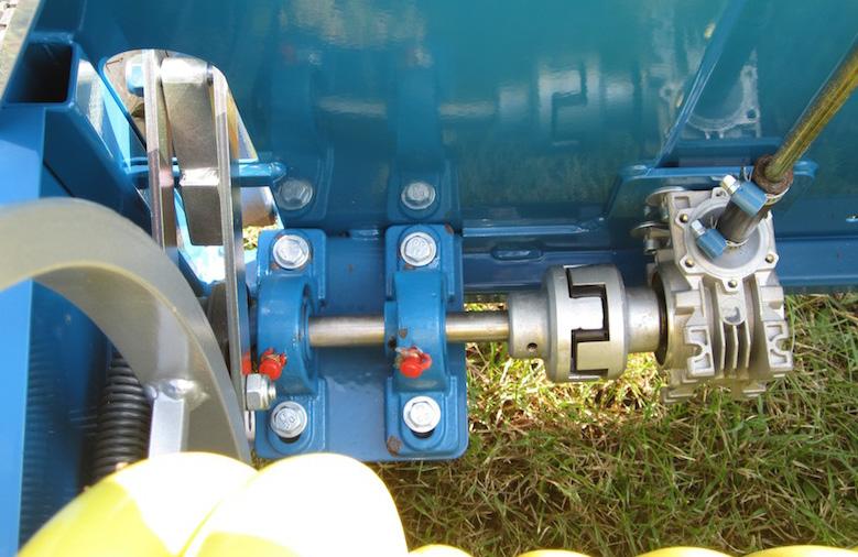 Her ses vinkelgear, trækaksel fra rotor samt kobling som overfører trækket til rem og remskive for indtræk af slange.