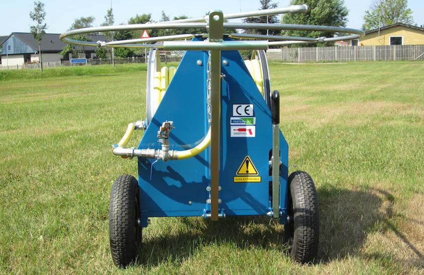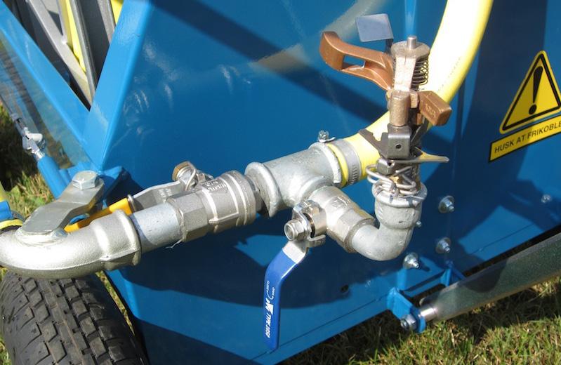 Til venstre på billedet ses den automatiske stophane til fremdrift. Desuden vises den lille 1/2” sprinkler med hane til at supplere vanding fra rotoren.