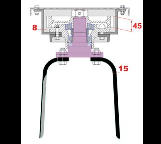 Auge de 8 mm d’épaisseur, arbres de 60 mm soutenus par des roulements coniques de haute qualité protégés par un joint d’huile inférieur et un labyrinthe mécanique. Porte-lame cannelé boulonné sur l’arbre avec raccord conique. L’arbre de la boîte de vitesses est fixé au rotor par une bride cannelée facilitant le retrait de la boîte de vitesses et réduisant les vibrations et contraintes provoquées par les rotors.