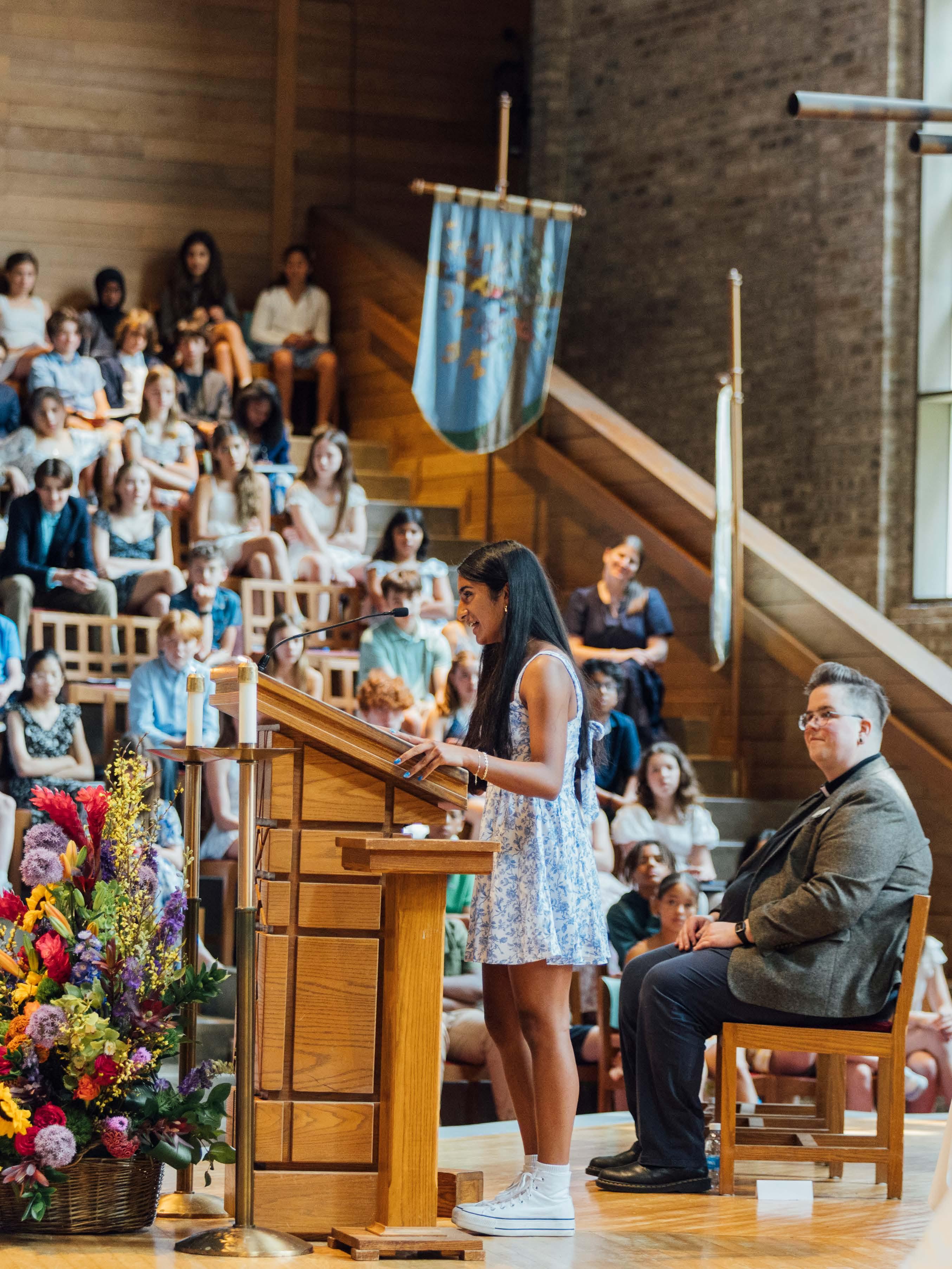 An eighth-grade student gives a speech to her peers at the end-of-year Middle School Closing ceremony.