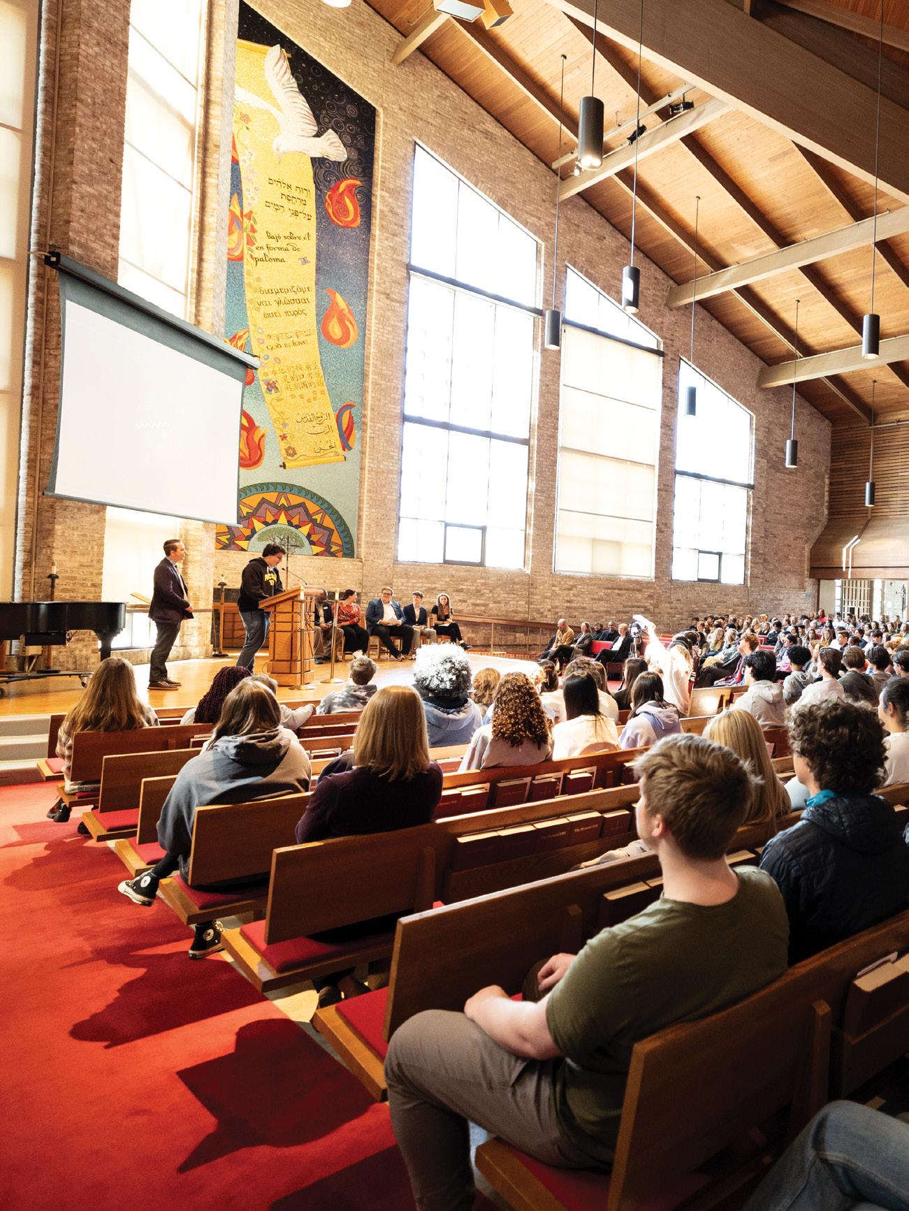 Breck Upper School students gather in the chapel as a community to support their peers during senior speeches, a beloved tradition.