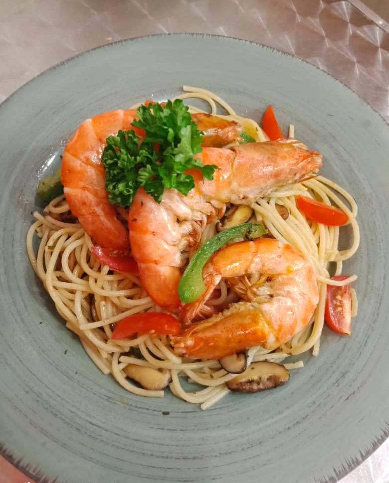 2. In a pan, heat medium fire and add oil and garlic. Stir to combine and add prawn & mushrooms.