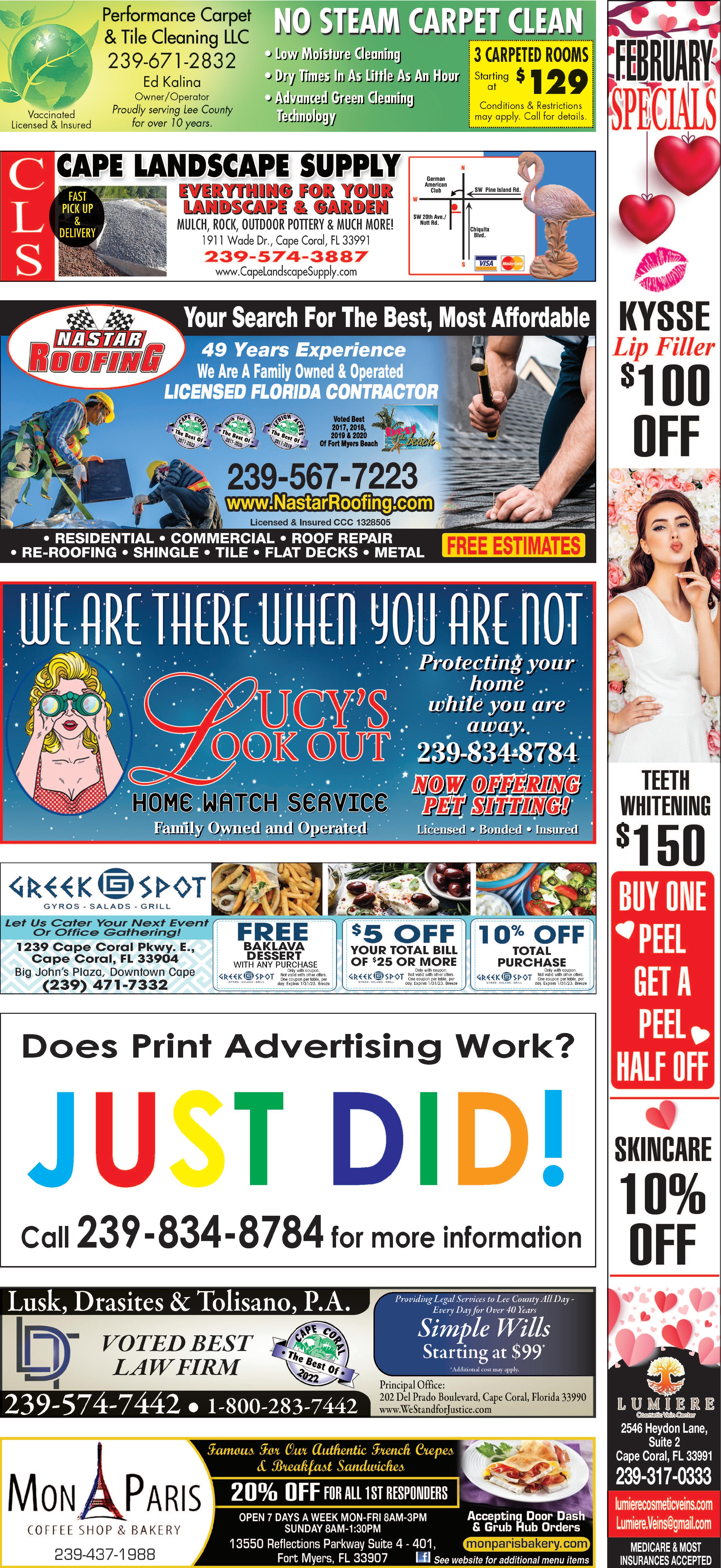 The sales data for this article was obtained from the Florida Realtors Multiple Listing Service Matrix for Lee County Fla as of Jan 30 2023 unless otherwise noted It was compiled by Bob and Geri Quinn and it includes information specifically for Cape Coral condominiums townhouses and villas, and it does not include any singlefamily homes, short sales or foreclosures The data and statistics are believed to be reliable however they could be updated and revised periodically and are subject to change without notice The Quinns are a husband and wife real estate team with the RE/MAX Realty Team office in Cape Coral They have lived in Cape Coral for over 43 years Geri has been a full-time Realtor since 2005, and Bob joined Geri as a full-time Realtor in 2014 Their real estate practice is mainly focused on Cape Coral residential property and vacant lots
