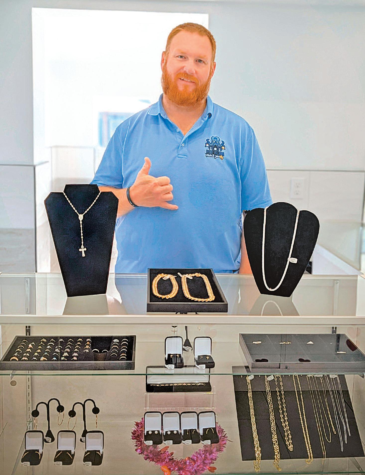 Zachary Woodhams, one of Pine Island Pawn and Jewelry’s owners, with some of the jewelry available in the store, which is located in Matlacha.