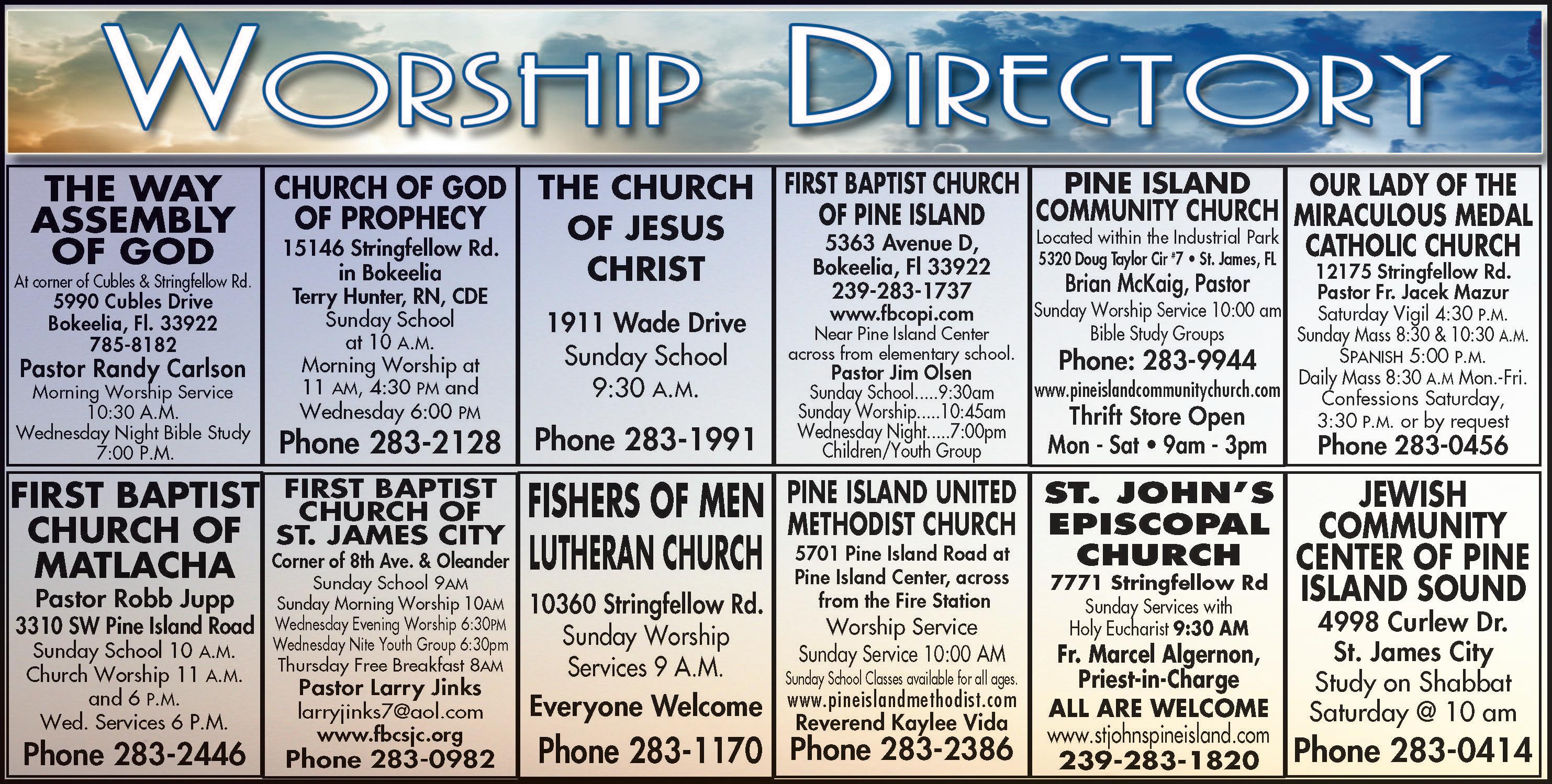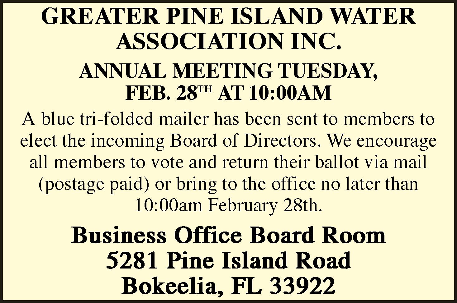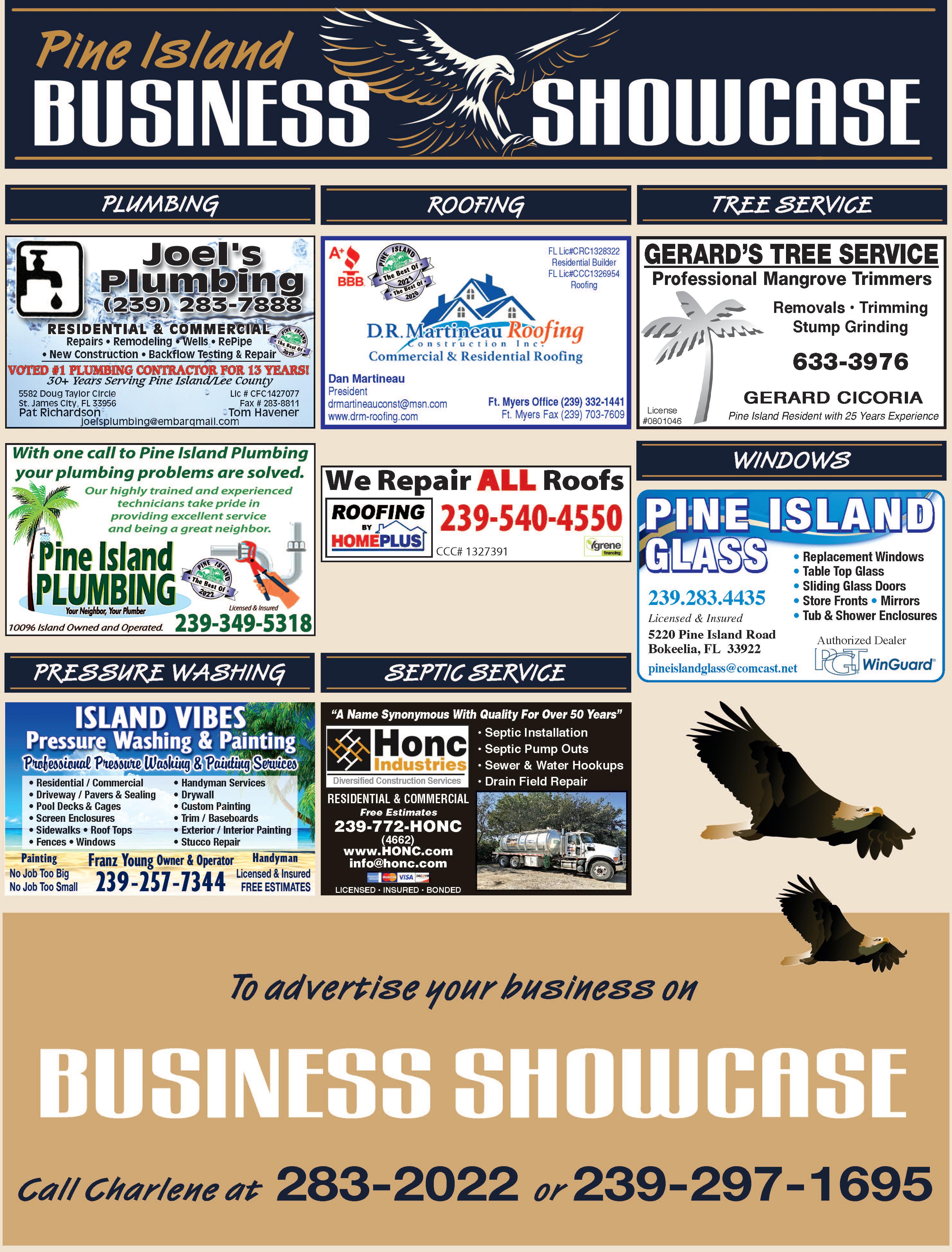 Subscriptions 1 Year $52 To Pay For Your Subscription P O Box 151306 Cape Coral FL 33915 Circulation (239) 574-1936 Classified Advertising (239) 574-5644 Display Advertising (239) 283-2022 Customer service hours are Monday through Friday, 8:30 a m to 5 p m , except major holidays Letters to the editor must be typed or handprinted Your name and phone number must be affixed to the copy In the event of an advertising error we are responsible only for the first incorrect insertion of the ad itself We are not responsible for any credit or reimbursement after 30 days from publication Postal Information: Bulk rate postage paid at Fort Myers, FL Postmaster Send address changes to the Pine Island Eagle Permit # 521 The Eagle is published every Wednesday 10700 Stringfellow Road, Ste 60 Bokeelia, FL 33922 Phone: (239) 283-2022 Fax: (239) 283-0232 Web: pineisland-eagle com