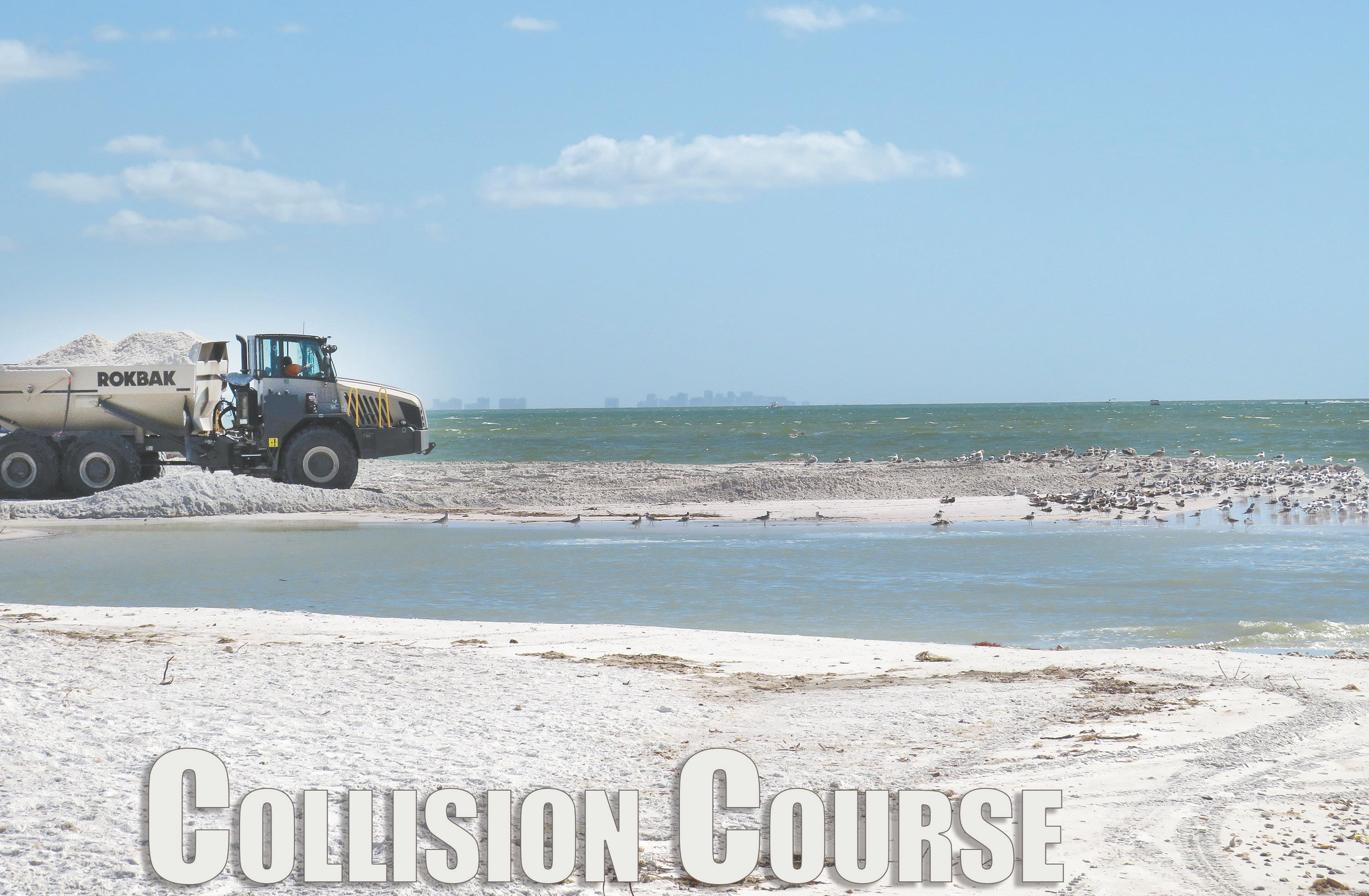 A contractor working for the Town of Fort Myers Beach renourishment project dumps sand near where hundreds of birds were congregating along a sandbar and the shoreline on the first day of shorebird nesting season for Southwest Florida, Feb. 15. The town’s beach renourishment project has continued into shorebird nesting season due to delays. NATHAN MAYBERG