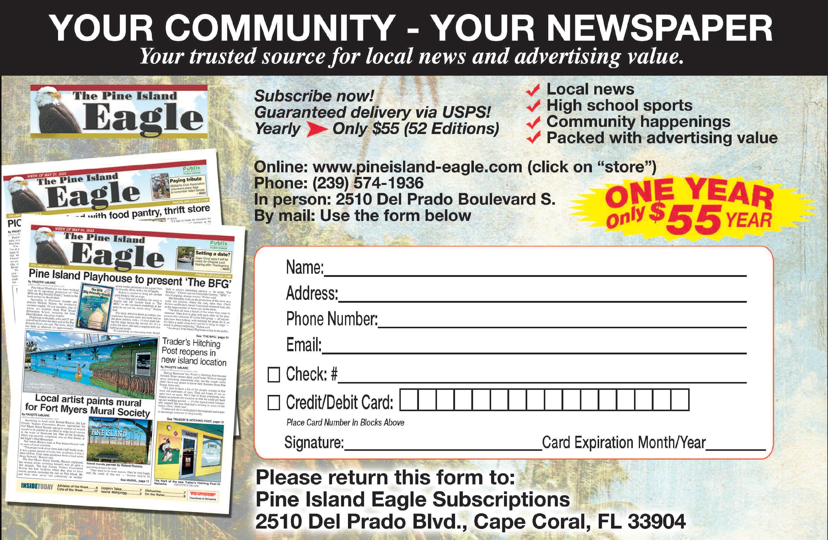 i v e a g e n d a , b u t h e u n d e r s t o o d h e h a d a r e s p o n s i b i l i t y t o a l l A m e r i c a n s , n o t j u s t t h o s e w h o a g r e e d w i t h h i m Ray Clasen North Fort Myers Report your news to PINEISLAND-EAGLE.COm OPINIONS Publisher Raymond M Eckenrode reckenrode@breezenewspapers com Executive Editor Valarie Harring vharring@breezenewspapers com Editor Paulette LeBlanc pleblanc@breezenewspapers com Advertising Director Laurie Ragle lragle@ breezenewspapers com Advertising Sales Charlene Russ cruss@breezenewspapers com Design & Layout Chris Strine cstrine@breezenewspapers com Obituaries Debbie Carletti obits@breezenewspapers com Subscriptions 1 Year $52 To Pay For Your Subscription P O Box 151306 Cape Coral FL 33915 Circulation (239) 574-1936 Classified Advertising (239) 574-5644 Display Advertising (239) 283-2022 Customer service hours are Monday through Friday, 8:30 a m to 5 p m , except major holidays Letters to the editor must be typed or handprinted Your name and phone number must be affixed to the copy In the event of an advertising error we are responsible only for the first incorrect insertion of the ad itself We are not responsible for any credit or reimbursement after 30 days from publication Postal Information: Bulk rate postage paid at Fort Myers, FL Postmaster Send address changes to the Pine Island Eagle Permit # 521 The Eagle is published every Wednesday 10700 Stringfellow Road, Ste 60 Bokeelia, FL 33922 Phone: (239) 283-2022 Fax: (239) 283-0232 Web: pineisland-eagle com Web Poll Previous Web Poll Question: Should the GPIA apply for a HUD grant for continued storm recovery? ■ Yes, it can’t hurt to try 50% ■ Yes, if it’s a benefit to all islanders 11% ■ Maybe depending on the request 0% ■ No 39% Current Web Poll Question: Will you be voting in the upcoming presidential primary?