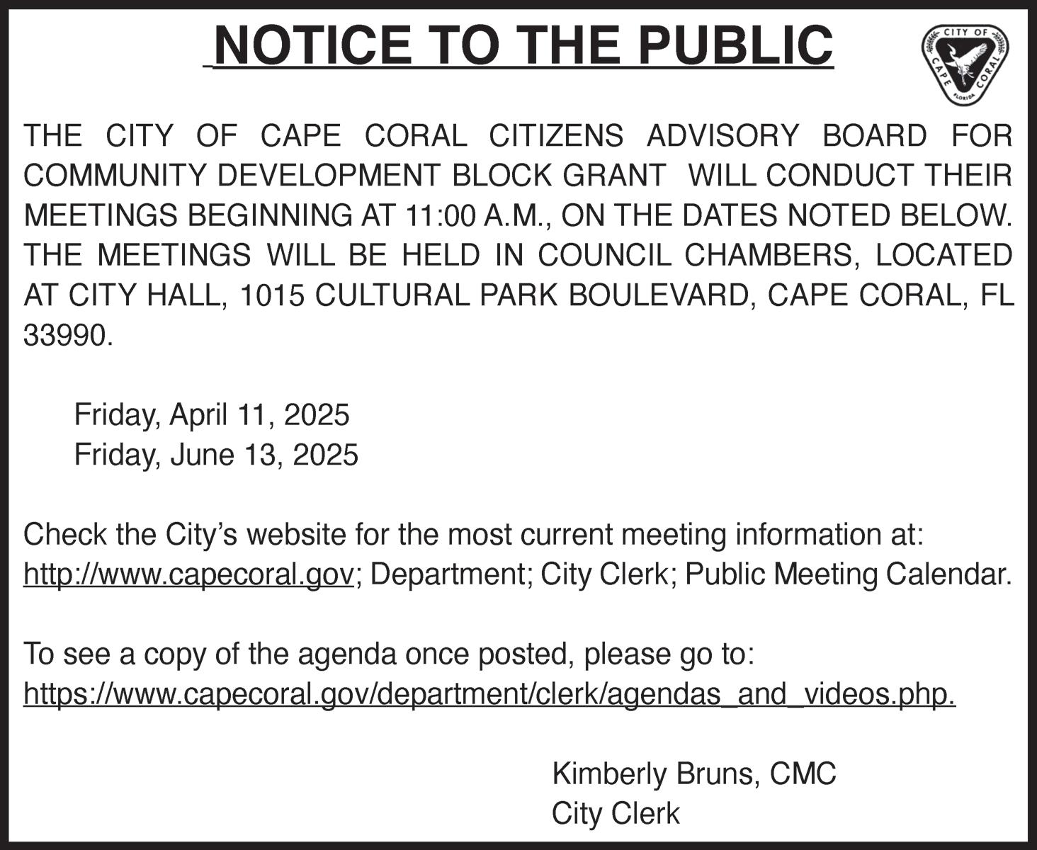 If you are a person with a disability who needs any accommodation in order to participate in this proceeding, you are entitled, at no cost to you, to the provision of certain assistance. Please contact Brooke Dean, Operations Division Manager, whose office is located at Lee County Justice Center, 1700 Monroe Street, Fort Myers, Florida 33901, and whose telephone number is (239) 5331771 at least 7 days before your scheduled court appearance, or immediately upon receiving this notification if the time before the scheduled appearance is less than 7 days; if you are hearing or voice impaired, call 711. WITNESS, my hand as Clerk of said Court and the Seal thereof, this 11 day of March 2025. Kevin C. Karnes, Clerk of Court By: As Deputy Clerk March 12, 19, 26, April 2, 2025 LC0017