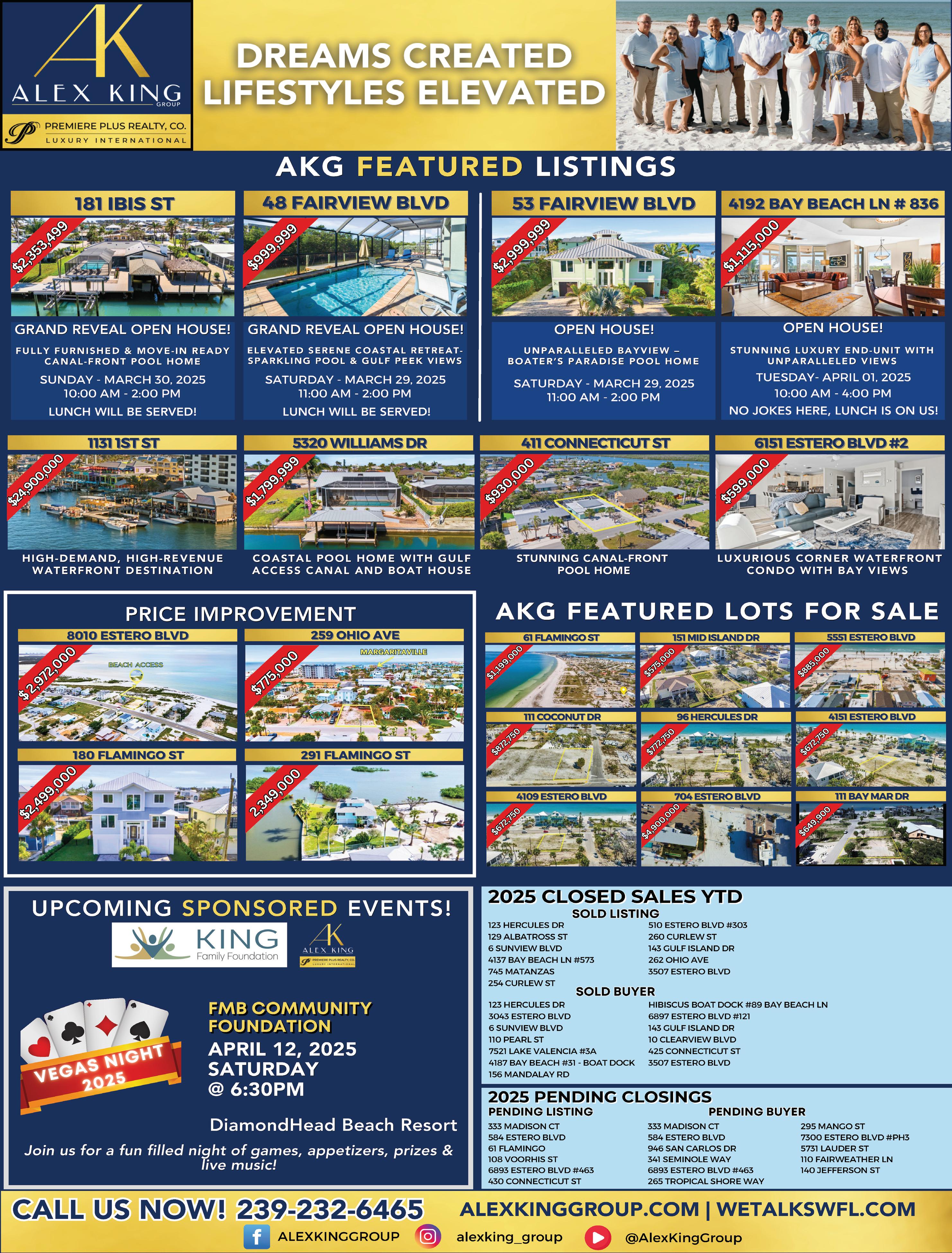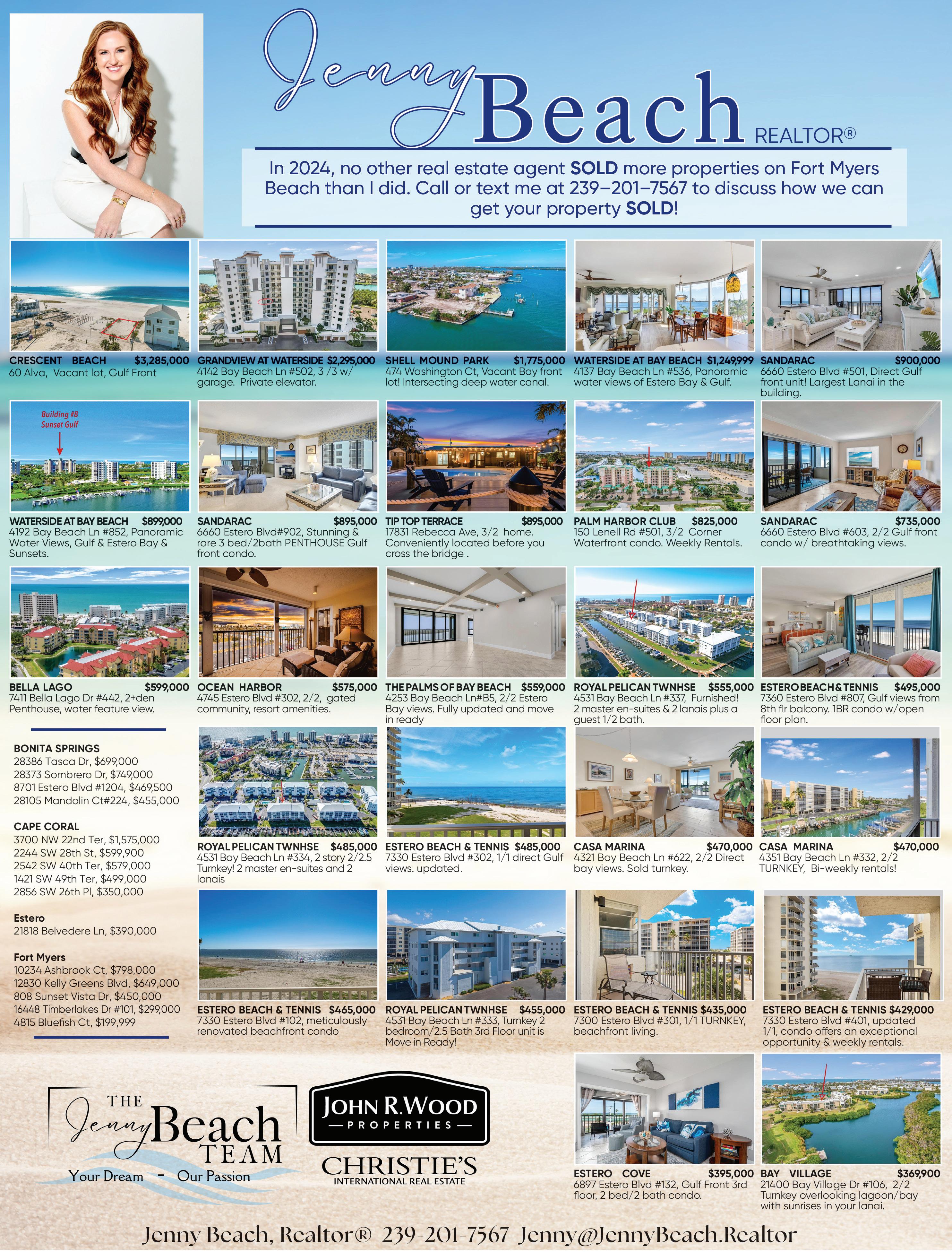 RARE OPPORTUNITY DIRECTLY ON ESTERO BLVD. , one-ofa-kind Gulf-side property next to Neptune & Diamondhead resorts just 1 mile from Margaritaville & Times Square. Highly desirable location w/access to the world-famous powder white sand beach. Now available for the first time in 50 years! Zoned RM, formerly a mixed use of 15 units: 13 residential vacation rental condo units, 2 commercial condo units. Walking distance to all beach activities, shopping, dining, & parks. Perfect for a unique Gulf-side luxury development! $3,995,000 FIFTH FLOOR 3BD/2BA just a short walk to the Gulf beach. Granite countertops in kitchen, dining & baths. Carpeted bedrooms, tile elsewhere. Electric shutters are on every window. The guest bathroom has been updated w/new sink, granite countertop, cabinet & mirror. Primary bath has new granite countertop & double sinks. Two guest bedrooms, with Queen bed in one & twin couch beds in the other. Pool, tennis, pickleball & shuffleboard. New 2023: roof, A/C & hot water heater. $599,000 THE BEACH, THE BAY, THE GULF WATERS - Island living at its best! Stylishly decorated 4BD/3BA single family island residence in a prime location offered turnkey. In an income producing weekly vacation rental neighborhood & just across the street from the beach. Easy bridge access. Hurricane impact windows, plantation shutters through-out, beautiful kitchen cabinets countertops, separate laundry room, upstairs deck, privacy fence, garage, storage, paved patio out back w/room for a pool! $899,900