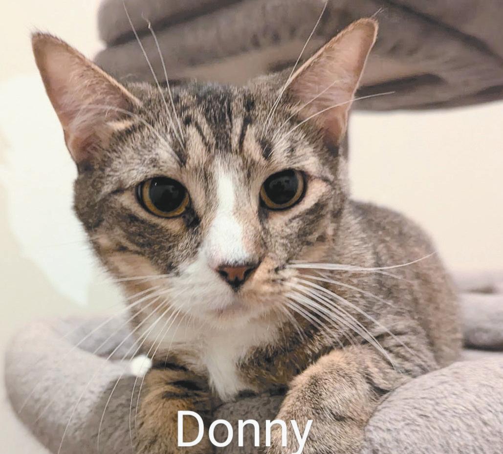 Donnie is an 18- month-old male tabby mix who has lots of white markings. He has a brother Ronnie who looks like a Maine coon and they are very close since been together since kittens and also rescued from a hoarding situation.