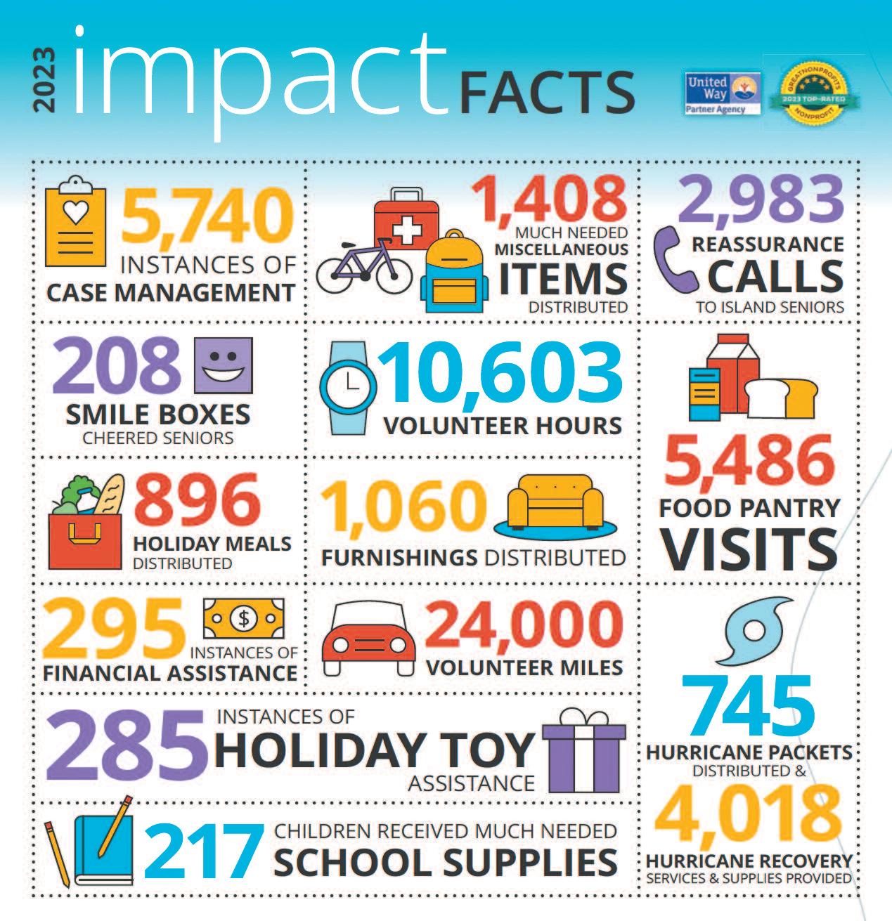 It offers programs representing its f o u r m a j o r p i l l a r s F o o d , I s l a n d Based Education, Social and Senior S e r v i c e s , a n d H e l p i n g H a n d s I t includes the food pantry, educational w o r k s h o p s , s c h o l a r s h i p s , a n d s e n i o r programs for dignified aging-in-place, along with additional services such as providing emergency help with expens-