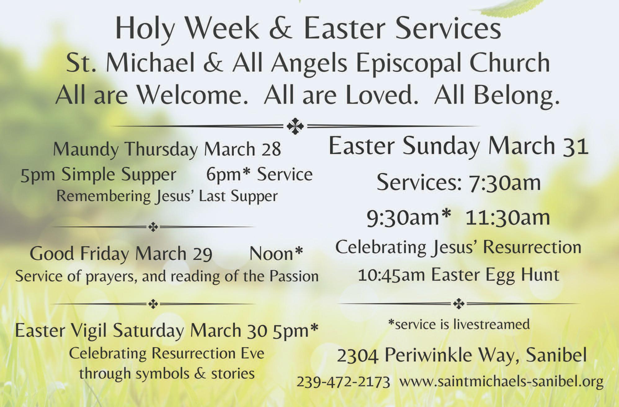 Maundy Thursday on March 28 at 6 p m , with a meal at 5 p m Good Friday on March 29 at noon Holy Saturday Easter Vigil on March 30 at 5 p m Easter Sunday on March 31 at 7:30, 9:30 and 11:30 a m , with an Egg Hunt at 10:45 a m