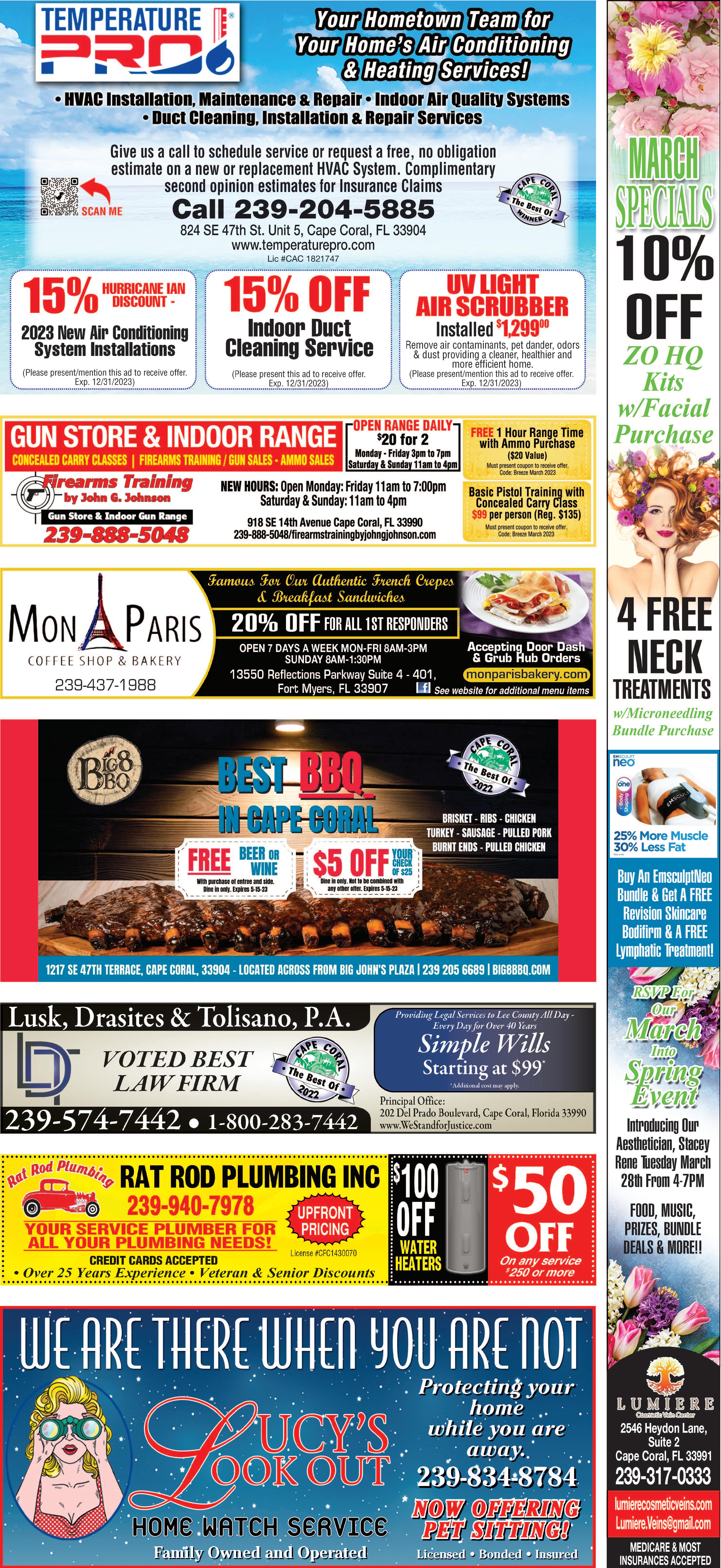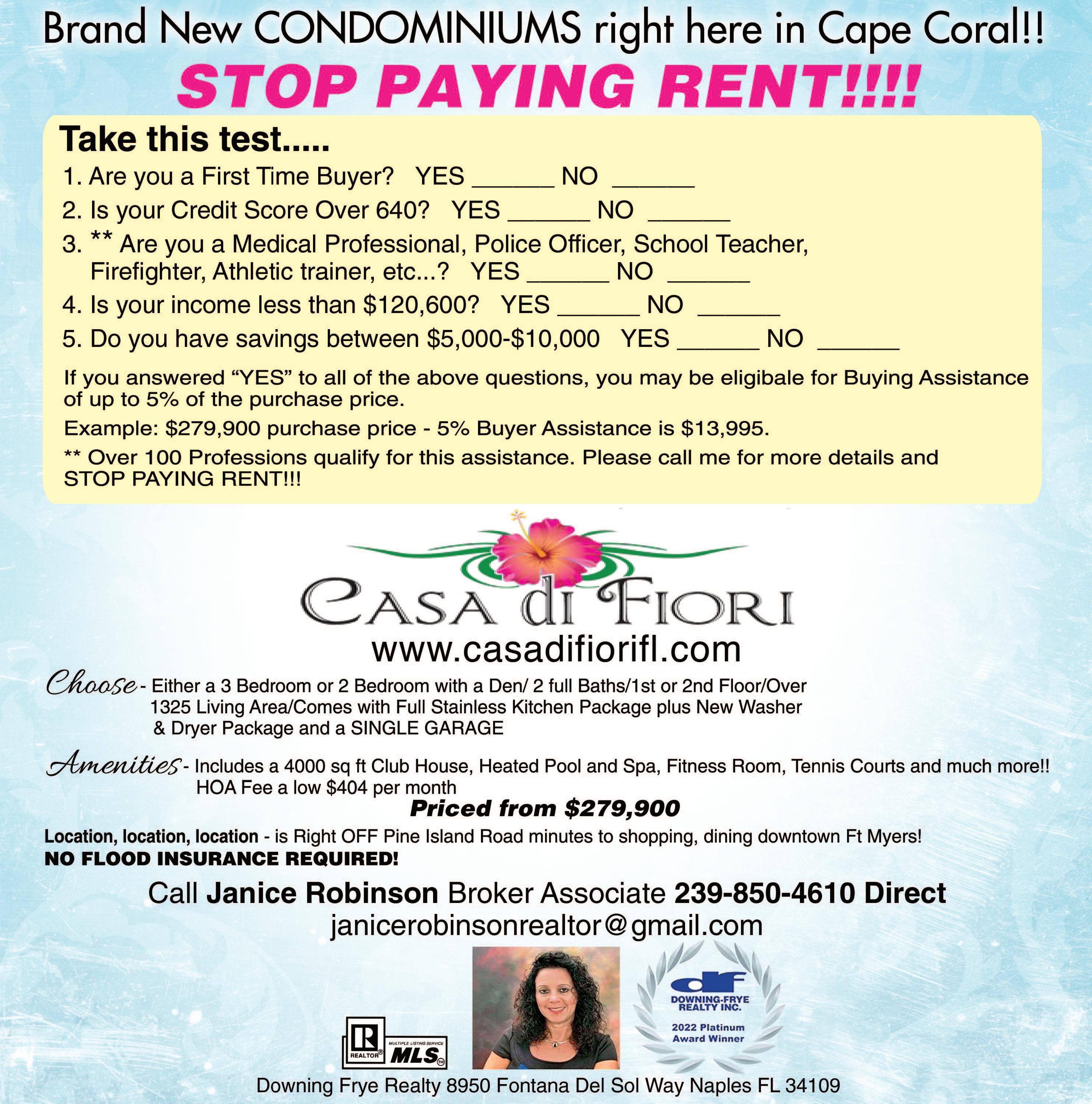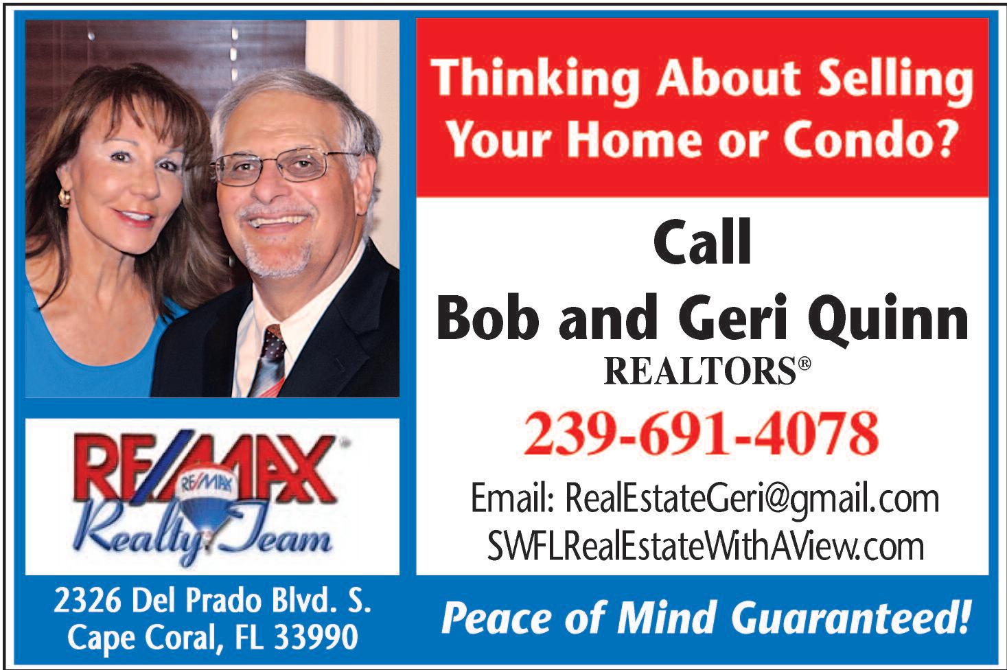 The sales data for this article was obtained from the Florida Realtors Multiple Listing Service Matrix for Lee County Fla as of March 24 2023 unless otherwise noted It was compiled by Bob and Geri Quinn and it includes information specifically for Cape Coral condominiums, townhouses and villas, and it does not include any single-family homes short sales or foreclosures The data and statistics are believed to be reliable, however, they could be updated and revised periodically and are subject to change without notice The Quinns are a husband and wife real estate team with the RE/MAX Realty Team office in Cape Coral They have lived in Cape Coral for over 43 years Geri has been a full-time Realtor since 2005 and Bob joined Geri as a full-time Realtor in 2014 Their real estate practice is mainly focused on Cape Coral residential property and vacant lots