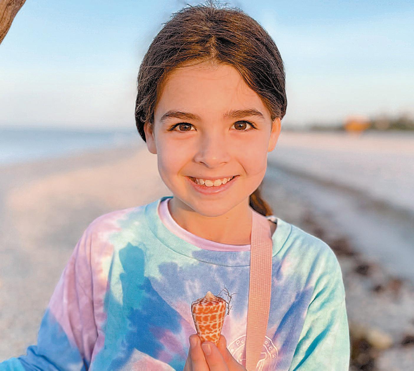 Maci Sossin, 8, of Buffalo Grove, Illinois, found an alphabet cone on the morning of March 25 along West Gulf Drive on Sanibel Karen Sossin reported that her daughter woke up at 6:30 a.m. to make sure to take advantage of the winds and low tide It was Maci's fifth time on the island, but it was her first year as a truly advanced sheller “She found her dream shell,” Sossin added “This made her whole trip to Sanibel!” To report a shell find, contact 239-4721587 or trepecki@breezenewspapers. com PHOTO